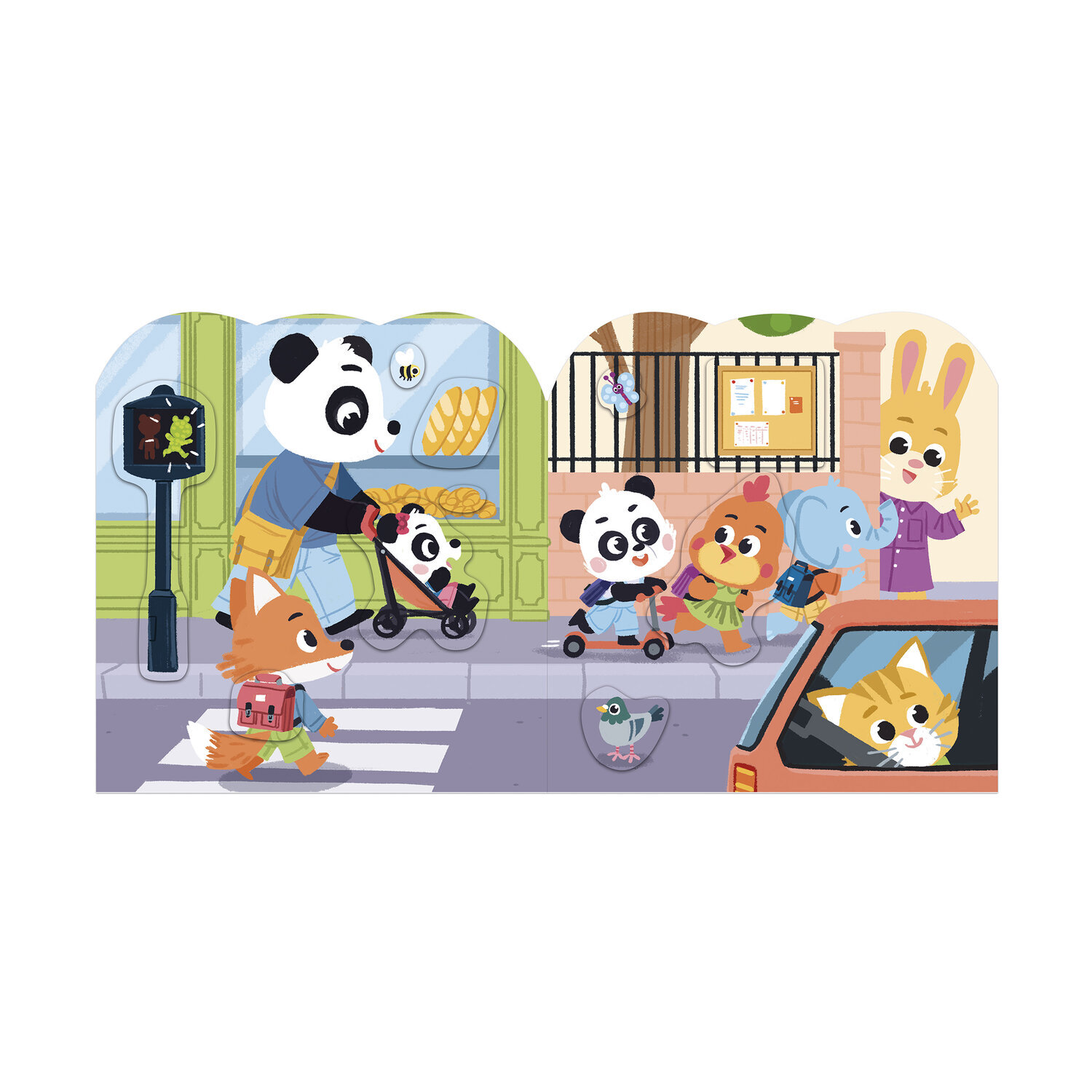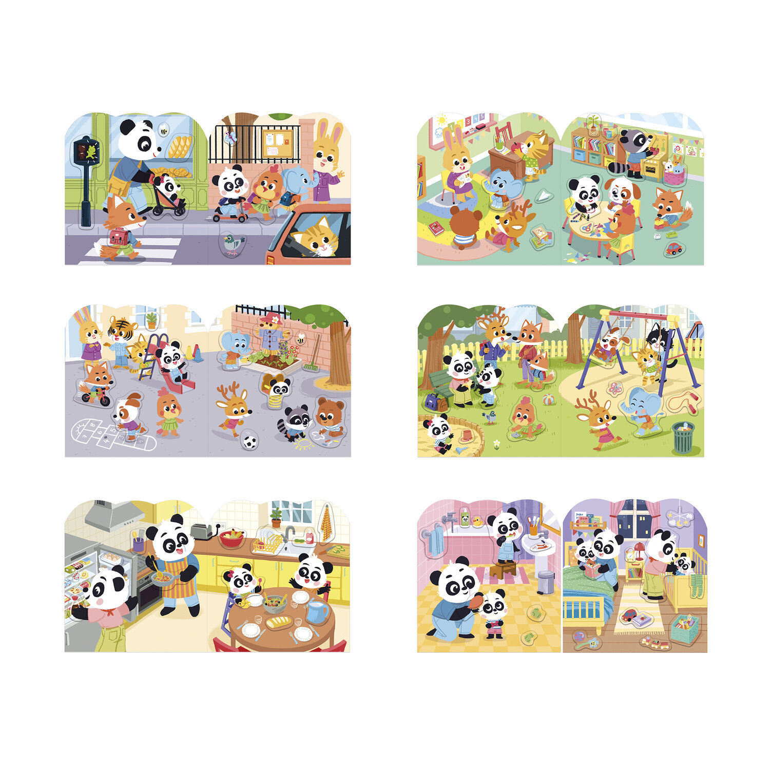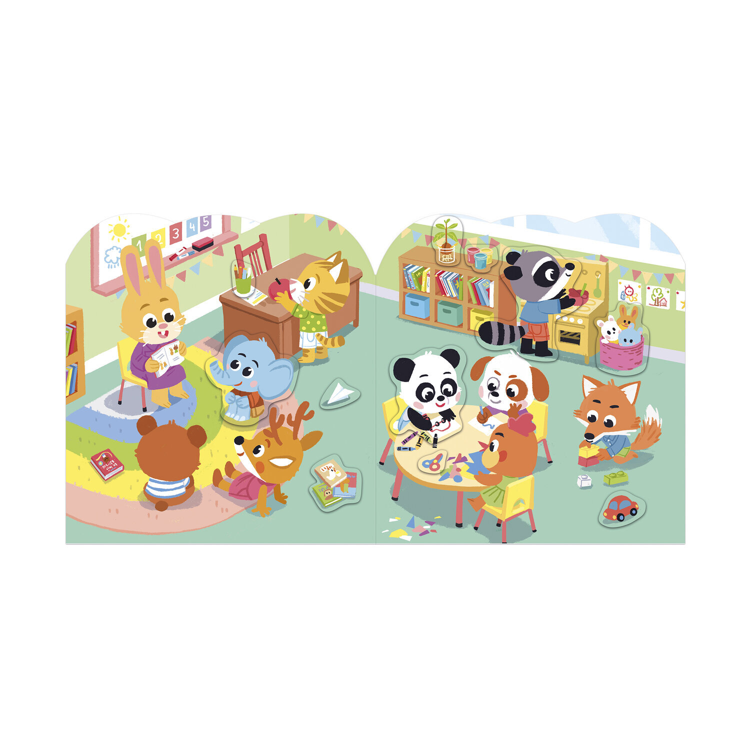 Čo si dnes robil/a? Tento tvarovaný zošit obsahuje 12 strán s ilustráciami s tematikou denného režimu (cestovanie do školy, prestávky na hranie atď.), ktoré je potrebné doplniť 8 stranami s priloženými nálepkami, čo je spolu 70 nálepiek. Otvory pre nálepky sú označené bledšou farbou, vďaka čomu sa ľahšie identifikujú. Každá nálepka má jednoduchý tvar bez orezávania, vďaka čomu sa ľahko uchopí. Ľahko sa lepia a odlepujú a nachádzajú sa na zošitých listoch v zošite. Táto aktivita pomáha rozvíjať trpezlivosť a jemnú motoriku. Je ideálna pre deti od 3 rokov.