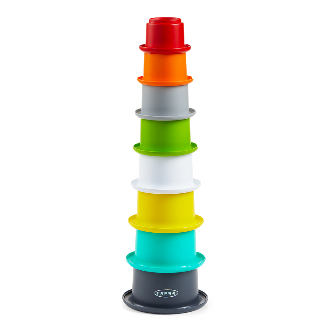Osm různobarevných kelímků v originálním provedení má perforované dno s plastickým obrázkem zvířátka. Naučte dítě stavět z kelímků vysokou věž, kterou potom může jedním mávnutím ruky zase zbourat, poznávejte spolu zvířátka i barvy a nebo kelímky využijte pro hraní s vodou během koupele.