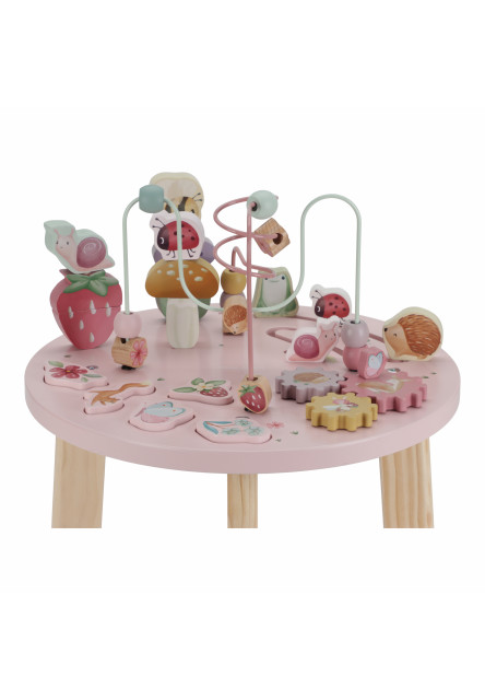 Drevený multifunkčný stolík v krásnom a vysoko kvalitnom prevedení ponúka vášmu dieťaťu množstvo rôznorodých aktivít, ktoré dieťa zabavia a zároveň pomáhajú rozvíjať jeho jemnú motoriku aj jednotlivé zmysly. Lákať dieťa na skúmanie budú pohyblivé, posuvné i odnímateľné drevené diely v podobe ježka, slimáka, lienky, jahôdky a ďalších motívov zo života na záhrade.