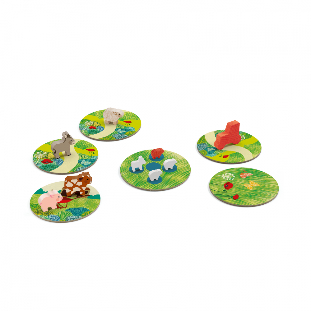 Obsah: 8 herných doštičiek (štartovacia (gazdovstvo), cieľová (pasienok), 5 cestičiek 1 doštička s mlákami), 4 veľké figúrky zvierat (krava, ovca, somár, prasa), traktor, 12 malých figúrok zvierat (4 zvieratá x 2 biele + 1 čierna), vrecúško.