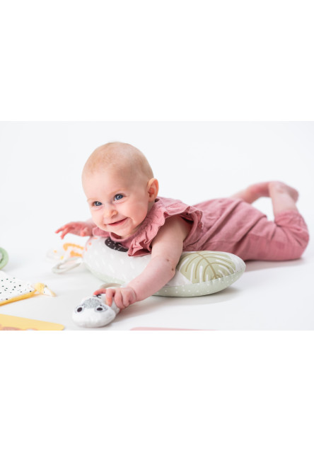 Polštářek z měkkého, příjemného materiálu je speciálně navržený, aby podporoval hraní dítěte na bříšku. Sada vysoce kontrastních obrázků a bezpečného zrcátka se dvěma stojánky je rovněž určena pro postavení před dítě v poloze na bříšku. Množství obrázků, které sada nabízí, umožňuje rodičům obrázky vyměňovat a udržovat tak déle pozornost dítěte. K polštářku je možné připevnit i chrastítko s kousátkem a šusticí textilní hračku v podobě roztomilého lvíčete.