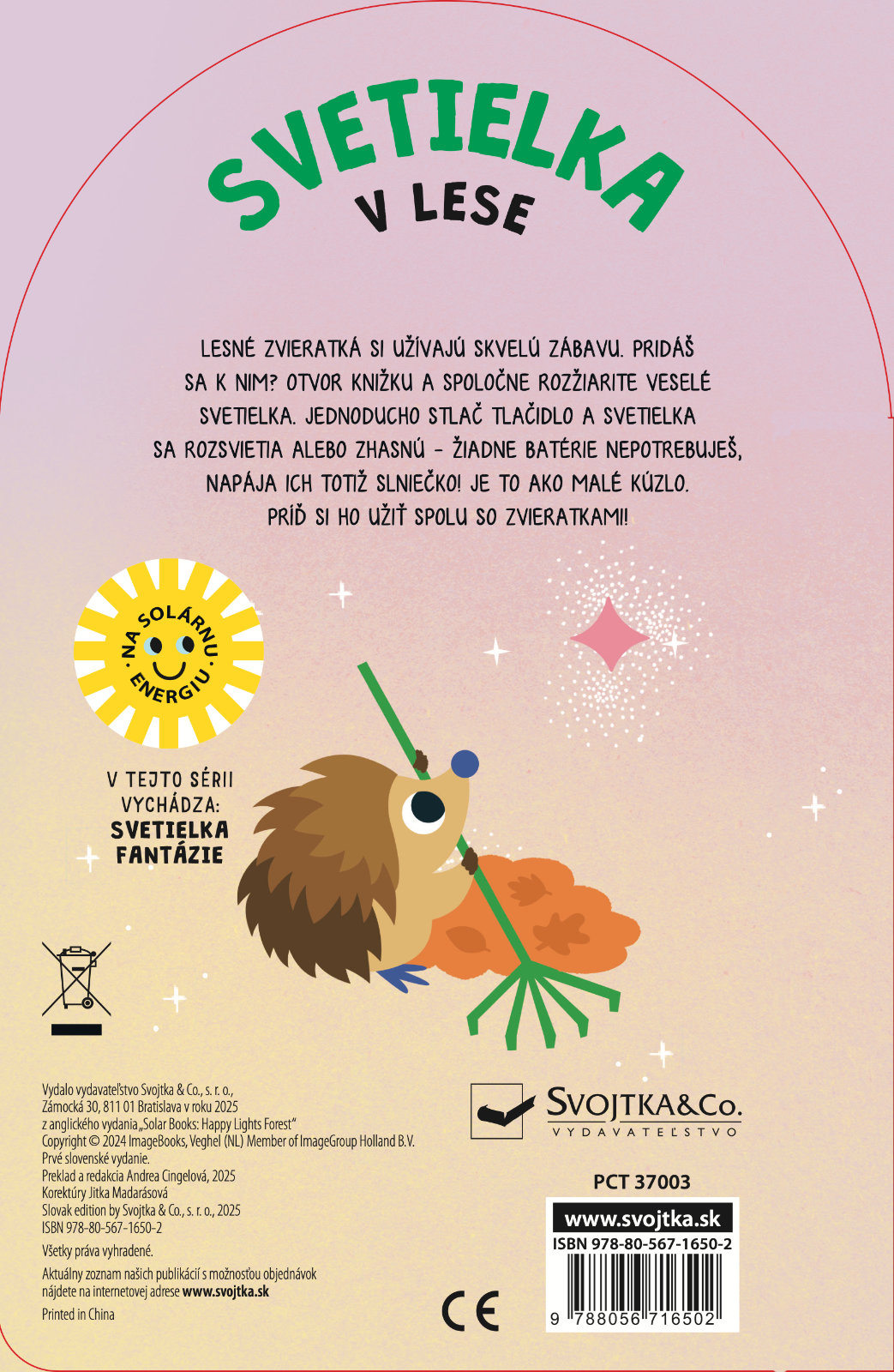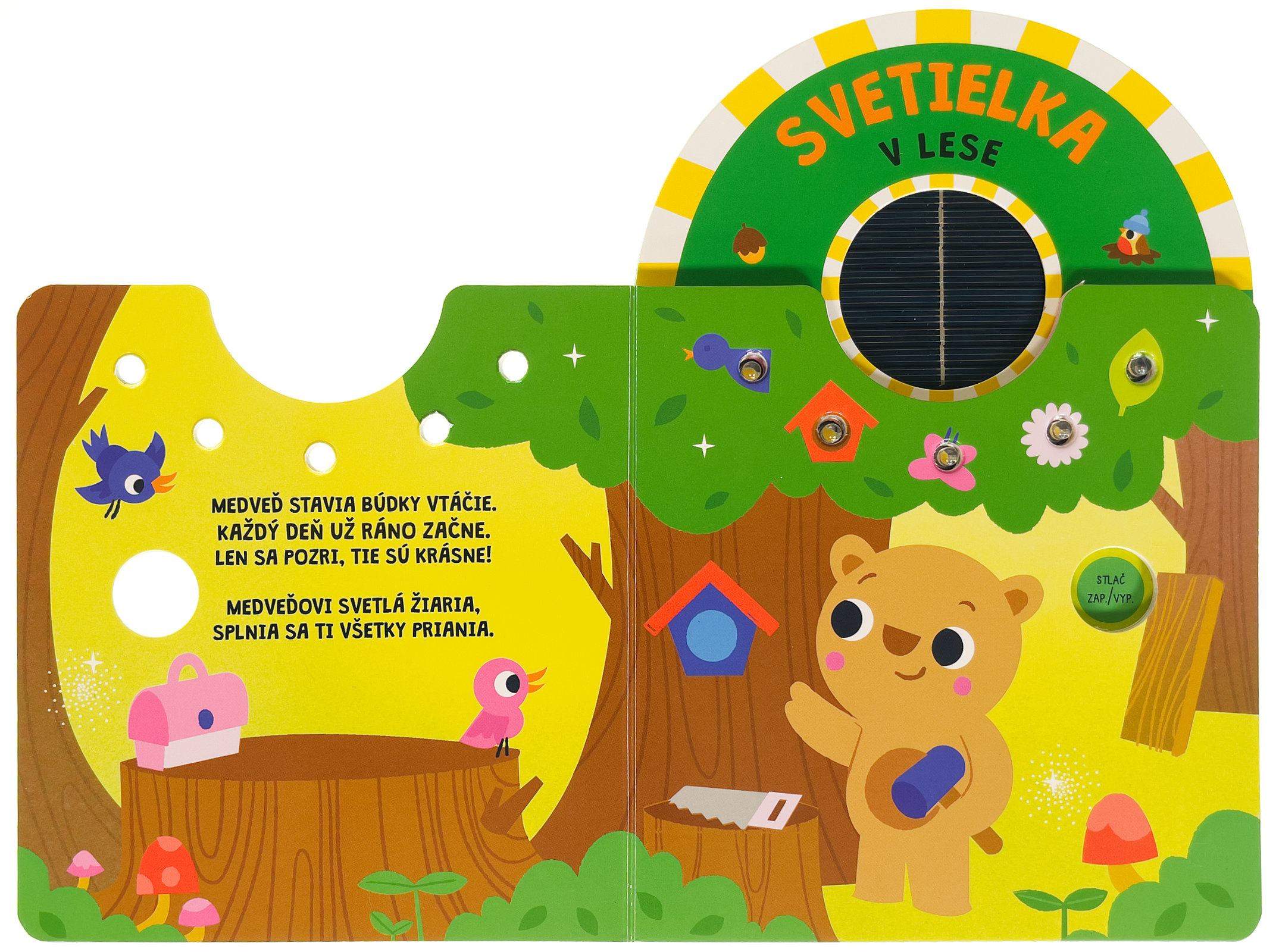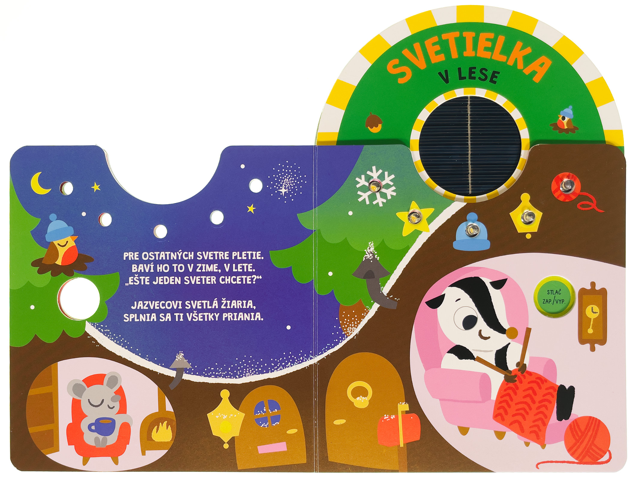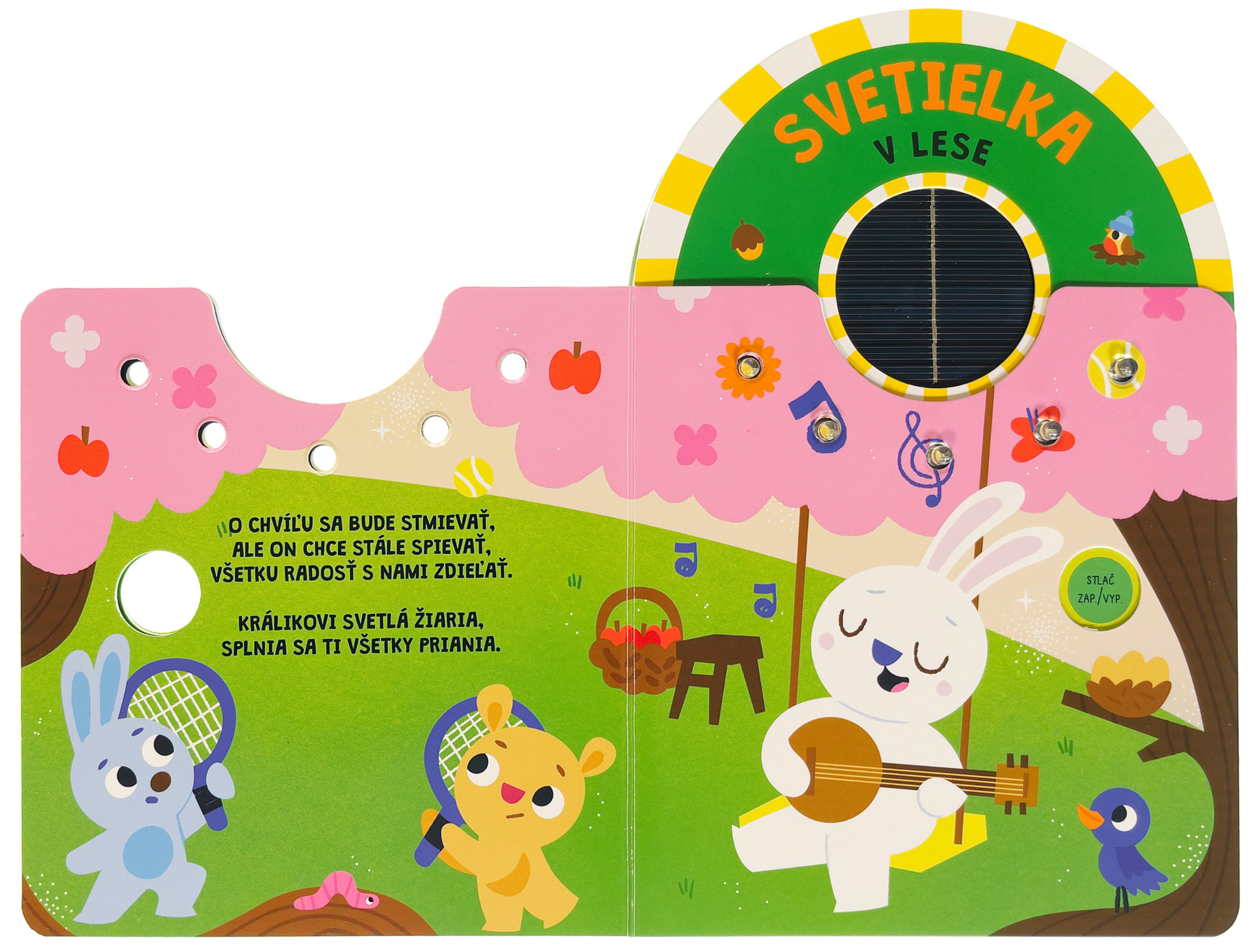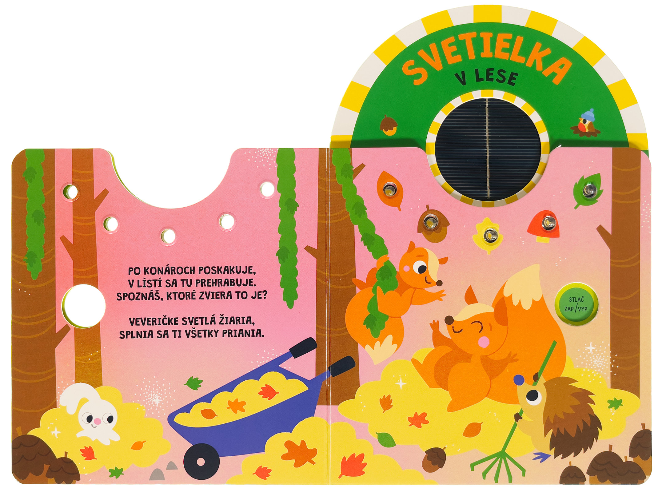 Medvedík, veverička, jazvec aj králik sa hrajú v lese plnom radosti. Ich príbehy sprevádzajú LED svetielka, ktoré vytvárajú svietiace reťaze, girlandy a dekorácie pôsobiace kúzelne a upokojujúco. Teplé jemne blikajúce svetlo nebodá do očí, navodzuje príjemnú atmosféru a knižku robí ideálnou voľbou na čítanie pred spaním. Vďaka napájaniu solárnou energiou nie sú potrebné batérie - stačí ju cez deň "nabiť" na slnku a večer stlačiť tlačidlo. Veršované texty a milé ilustrácie podporia predstavivosť aj radosť zo spoločného čítania.Počet strán: 10