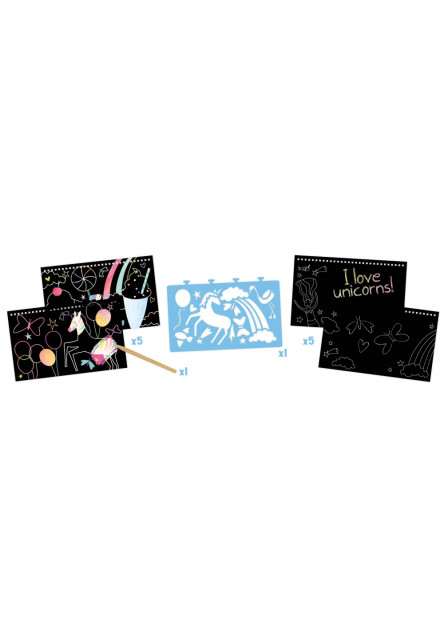 Obsahuje: 10 stíracích skicáků, 1 dřevěný stylus, 1 odnímatelný list, šablony