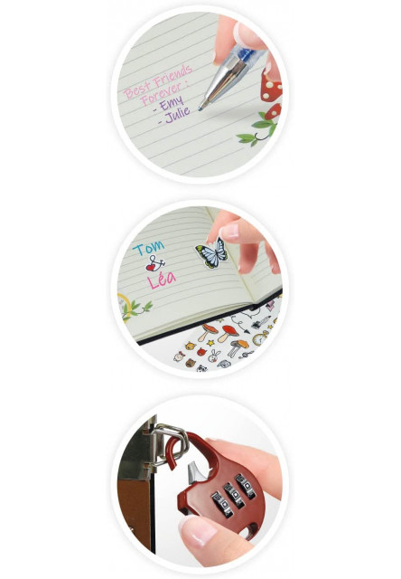 Sada obsahuje tajný zápisník so 120 stranami, vnútornú dekoráciu, ktorú možno spredu ozdobiť trblietavými kameňmi, funkčný kódový zámok pre denník, ktorý si môžete sami nastaviť a zmeniť, UV marker, pomocou ktorého môžete písať neviditeľné správy a zviditeľniť ich UV svetlom, a 12 gélových pier pre farebné a efektívne poznámky.