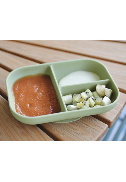 Talíř s přísavkou z vysoce kvalitního silikonu umožňuje uchycení ke stolu nebo pultu jídelní židličky. Ergonomický tvar usnadňuje nabírání příkrmu. Tři přihrádky umožňují oddělené servírování jednotlivých součástí dětského pokrmu.