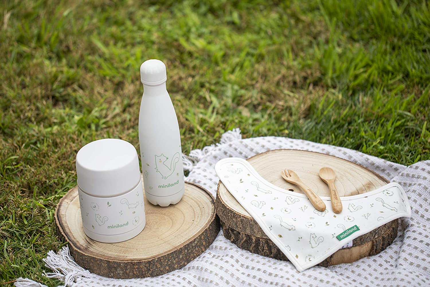 Vakuová termoska Miniland ve tvaru láhve je vyrobena z vysoce kvalitní dvoustěnné oceli a díky tomu udrží až 24 hodin požadovanou teplotu nápoje. Termoska je potažena jemným materiálem pro příjemné uchopení.