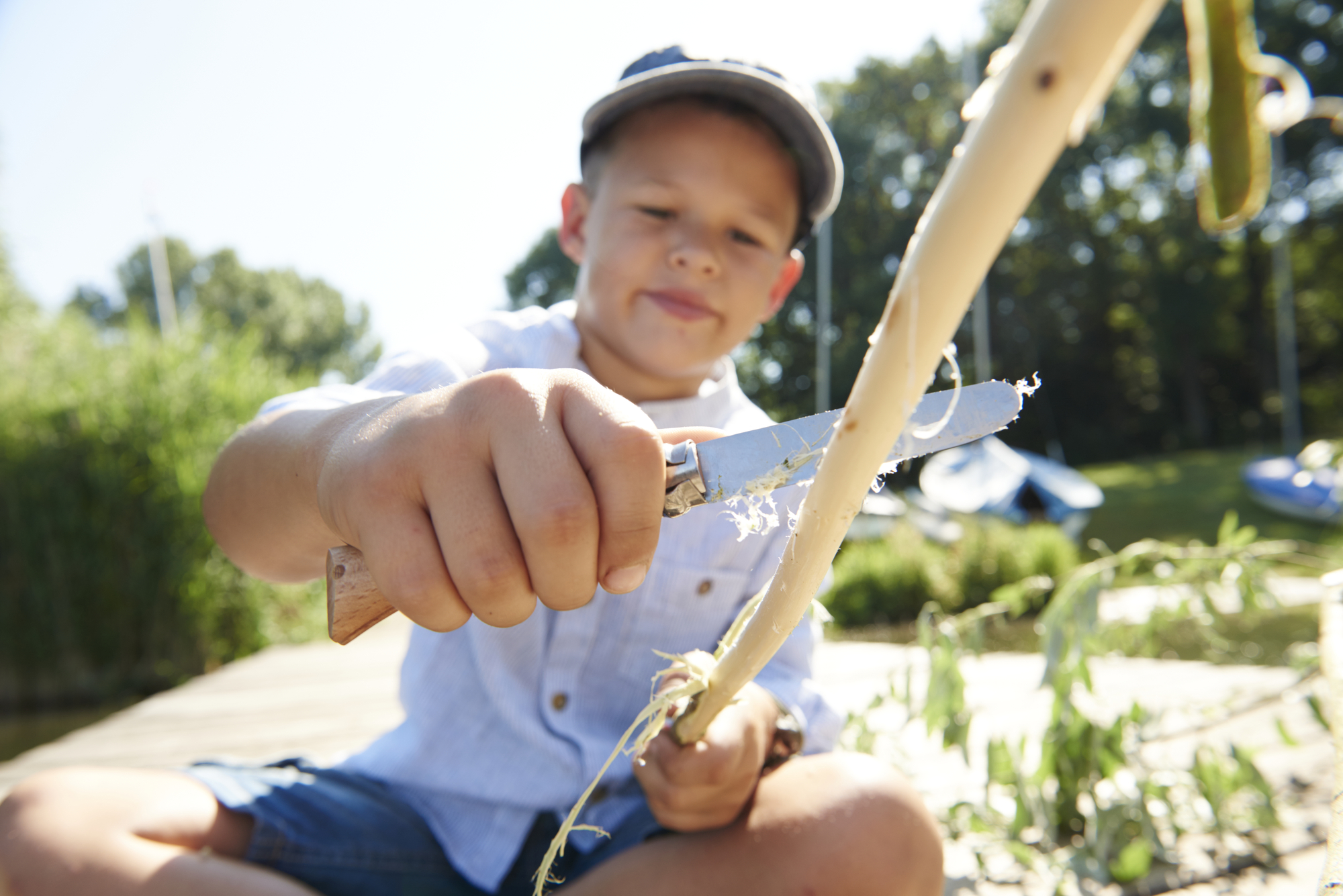 Praktický detský vreckový nôž z dreva a nehrdzavejúcej ocele je pevný a deťom sa ľahko a bezpečne drží v ruke. Má zaoblenú špičku a dvojitý bezpečnostný krúžok, ktorý zabraňuje nechcenému zaklapnutiu alebo otvoreniu noža. Či už pri vyrezávaní, tvorení z prírodných materiálov alebo pri pikniku – tento vreckový nôž má mnohostranné využitie. Po použití sa dá bezpečne uložiť do priloženého filcového puzdra a vďaka hliníkovej karabínke jednoducho pripevniť na batoh alebo opasok.