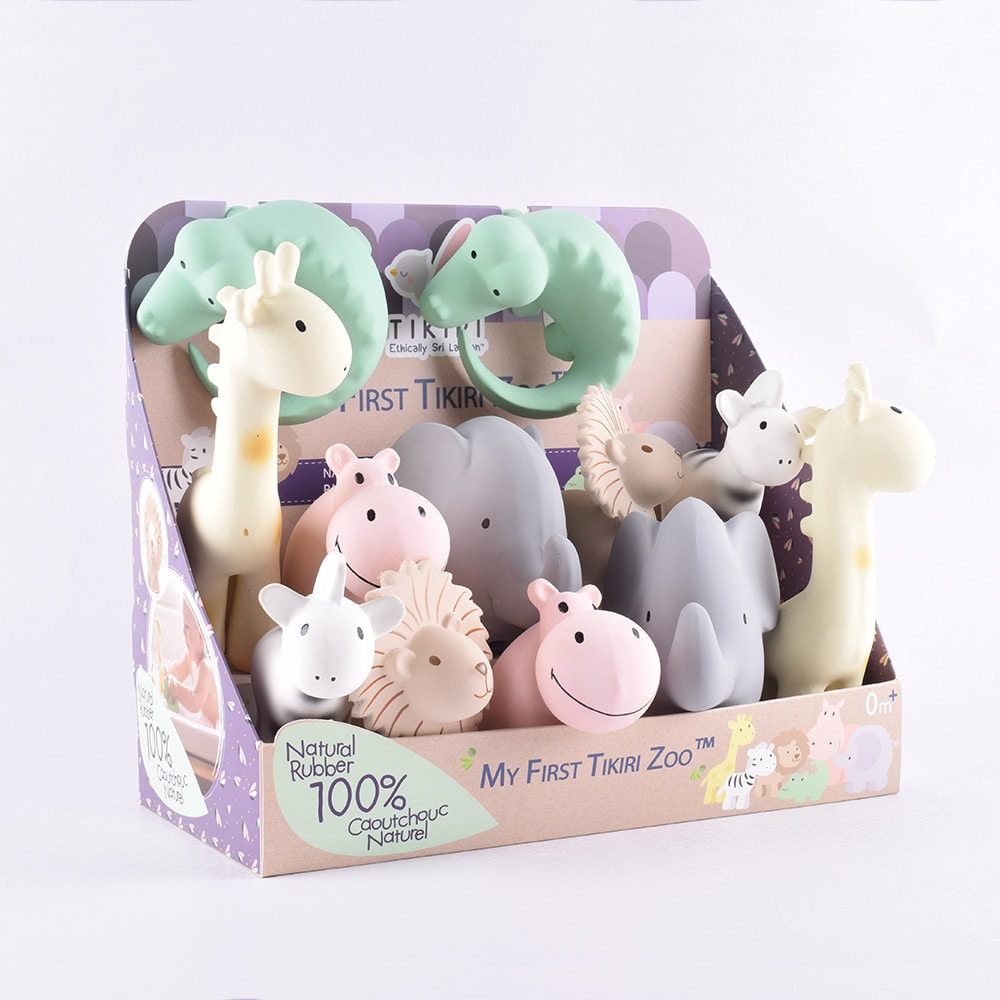 Roztomilé Tikiri zvieratká sú vyrobené z príjemne jemnej mäkkej prírodnej gumy z kaučukového stromu Hevea. Zvieratká nemajú žiadny otvor, ktorým by sa do vnútra mohla dostať vlhkosť, takže sú ideálne ako hračka do kúpeľa alebo hryzátko pri prerezávajúcich sa zúbkoch. Deti obľubujú špecifickú príjemnú vôňu a chuť prírodnej gumy a zaujme ich aj zvuk jemne znejúcej hrkálky vnútri zvieratka. Tikiri Safari sú roztomilí kamaráti zo džungle, zvieratká, ktoré sú všetkým malým objaviteľom dobre známe. Tikiri sú prvé kaučukové hračky certifikované GOLS (Global Organic Latex Standard). Prírodný BIO kaučuk vyrobený z miazgy kaučukového stromu Hevea, ktorá je pravidelne šetrne a udržateľne odoberaná tak, aby strom netrpel. Ekologický, v prírode rozložiteľný materiál, bezpečný aj pre tie najmenšie bábätká. Ručne maľované netoxickými rastlinnými farbami. Neobsahuje BPA, PVC, ftaláty ani žiadne iné škodlivé látky. Vhodné od narodenia. Vďaka ručnej práci je každé zvieratko jedinečné a prípadné drobné nerovnosti materiálu a odlišnosti v kresbe sú prirodzenou vlastnosťou. Údržba: Povrch umyte vodou a jemným saponátom a nechajte vyschnúť. Neskladujte vo vlhkom prostredí ani na priamom slnečnom žiarení. Nesterilizujte. Všetky Tikiri produkty sú vyrobené s ohľadom na životné prostredie. Vieme, že rešpektovať životné prostredie znamená rešpektovať celú našu planétu, ktorú tak chránime pre ďalšie generácie.