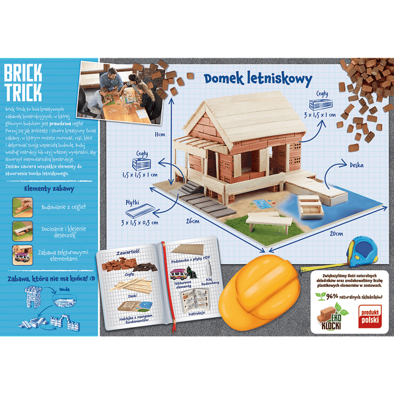 Postavte si letný dom pomocou skutočných tehál, dreva a dekoratívnych prvkov. Použite priložené stavebné plány alebo použite svoju predstavivosť a vytvorte si vlastnú jedinečnú štruktúru. Tam zábava nekončí! Rozpustite štruktúru vo vode a pokračujte v stavbe opätovným použitím tých istých tehál! V balení nájdete: skutočné tehly, drevené dosky, lepidlo, ozdobné prvky, základňu, nálepku a návod. Záleží nám na životnom prostredí, a preto sada obsahuje 96% prírodných zložiek! EKO bloky = zaručená zábava!