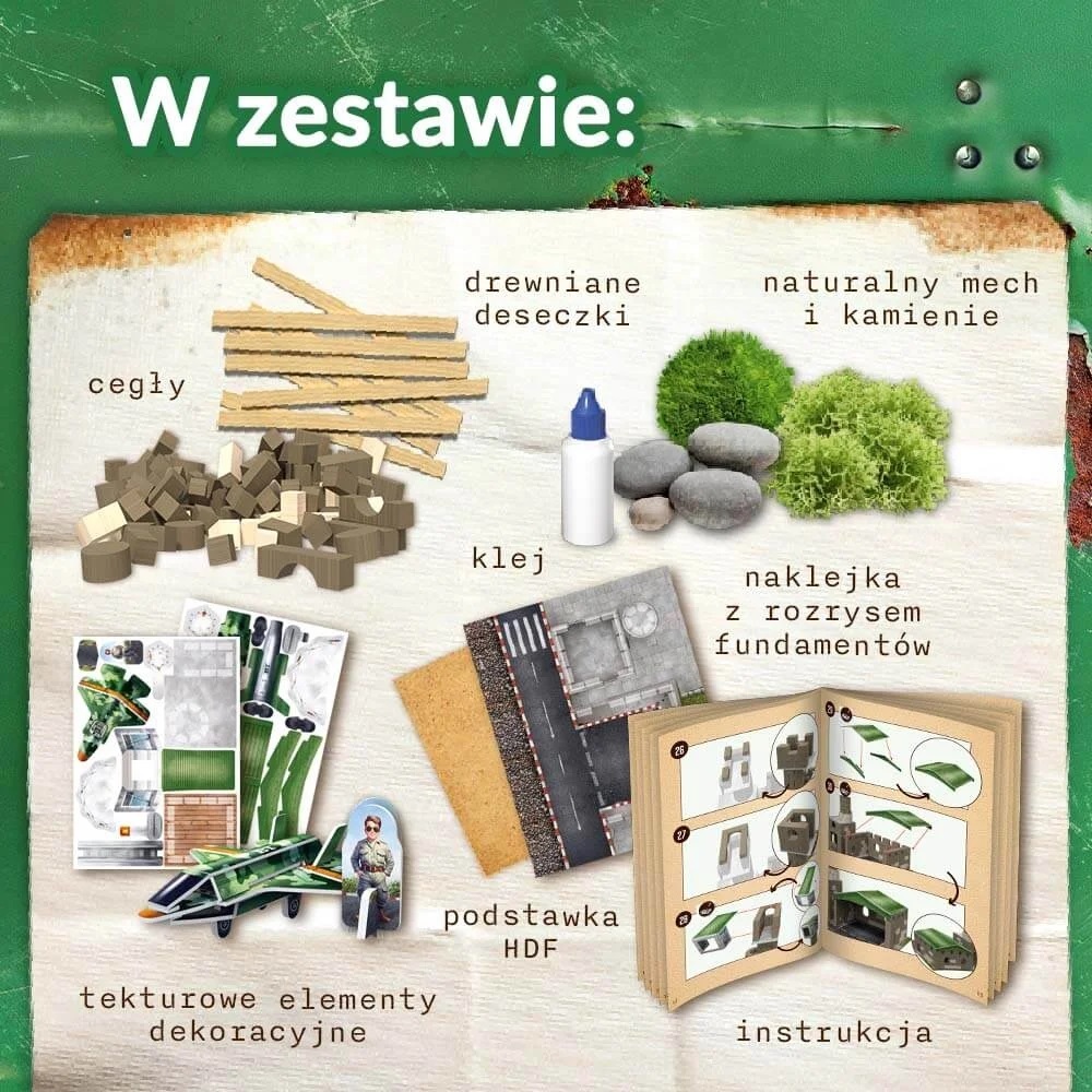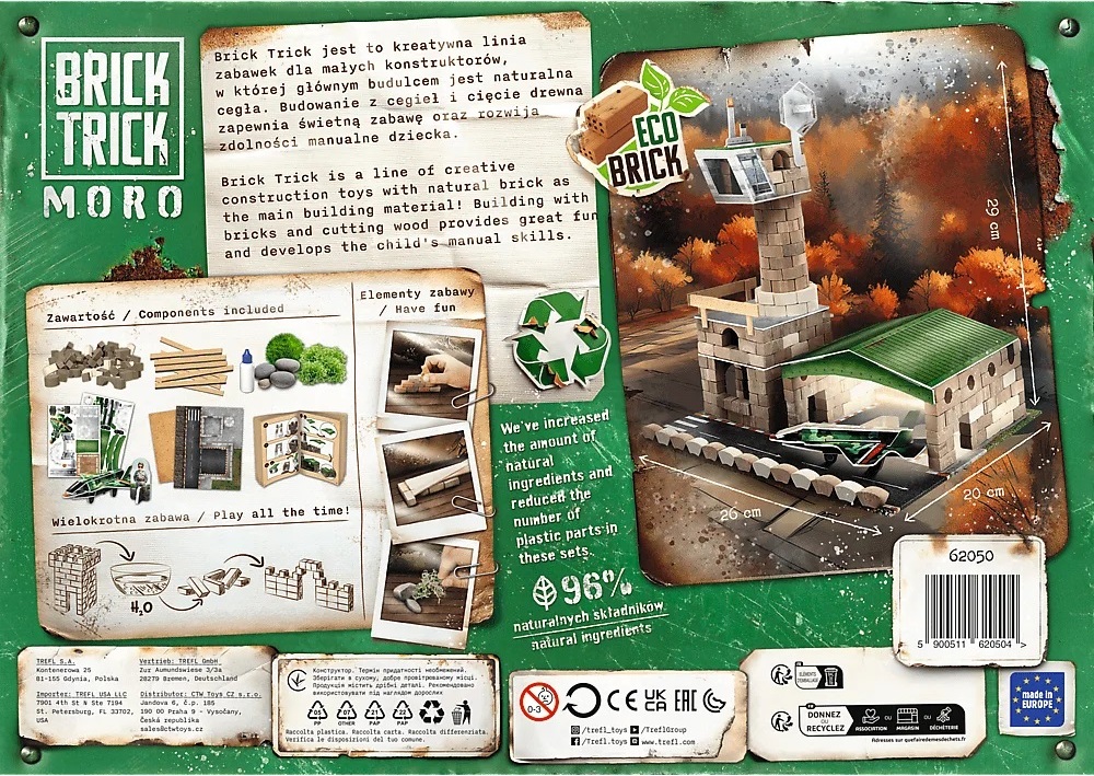 Vžite sa do úlohy staviteľa a postavte vojenské letisko pomocou skutočných tehál a drevených dosiek! Použite hotové stavebné plány alebo popustite uzdu svojej fantázii a vytvorte si vlastnú jedinečnú štruktúru, potom pridajte prírodný mach, kamene a kartónové prvky na ozdobenie okolia. Tam zábava nekončí! Lepidlo sa rozpustí vo vode – rozpustite štruktúru a pokračujte v stavbe opätovným použitím tých istých tehál! Brick Trick Moro je séria úžasných stavebníc, ktoré vás zavedú do sveta vojenských dobrodružstiev a záchranných misií. Staráme sa o životné prostredie, a preto súprava keramických blokov vojenského letiska obsahuje až 96% prírodných zložiek ! EKO bloky sú zaručená zábava! Brick Trick Keramické bloky – Vojenské letisko Postavte pôsobivé vojenské letisko pomocou viac ako 360 skutočných kociek! Použite priložené stavebné plány alebo použite svoju fantáziu na vytvorenie realistického letiska s riadiacou vežou, hangárom a pristávacou dráhou. Celé je to ladené v módnych zelených farbách, čo dodáva hračke realistický charakter. V balení nájdete: skutočné tehly, lepenkové ozdobné prvky, lepidlo, základňu, nálepku a podrobný návod na stavbu. Dokončili ste stavbu? Tam zábava nekončí! Štruktúru rozpustite vo vode a postavte znova s ??použitím rovnakých tehál. EKO bloky = zaručená zábava! Tehlové bloky! Zábava a rozvoj v jednom Súpravy keramických blokov Brick Trick rozvíjajú manuálne zručnosti, stimulujú kreativitu a podnecujú predstavivosť. Podporujú rozvoj stavebných, priestorových a koncentračných schopností. Ide o dokonalú hračku, ktorá zapojí a rozvíja vaše dieťa na mnohých úrovniach. Obsah balenia tehly lepidlo HDF stojan lepenkové dekoratívne prvky nálepka s rozložením základov podrobný návod na stavbu
