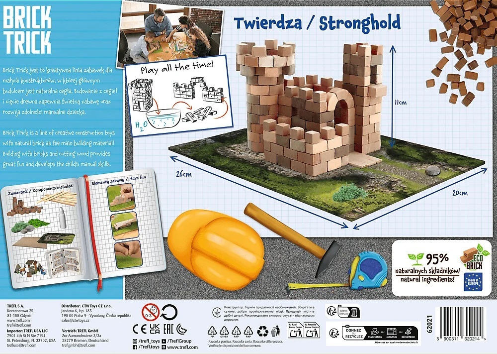 Postavte pagodu zo skutočných tehál a dekoratívnych prvkov. S produktmi Brick Trick sa zoznámite s niektorými populárnymi a obľúbenými pamiatkami a hlavne získate možnosť postaviť si ich od základov. Skladajte tehlu za tehlou, režte a lepte dosky, postupujte od základov až po dokončenú budovu a nakoniec svoj výtvor ozdobte priloženými dekoráciami. Stavajte krok za krokom podľa návodu alebo nájdite a zrealizujte svoje vlastné riešenie. Oživte svoju dokončenú stavbu papierovými figúrkami. Pokiaľ spojíte niekoľko sád TREFL Brick Trick, môžete vytvoriť malebnú dedinku, moderné mesto alebo stredovekú osadu. Stavebnicu je možné používať opakovane (lepidlo je rozpustiteľné vodou). Stavebnice Brick Trick od výrobcu TREFL zlepšujú zručnosť, rozvíjajú predstavivosť a podporujú sústredenie. Balenie obsahuje: 220 prírodných hlinených tehličiek, drevené dosky, základovú dosku, ozdobné prvky, lepidlo, obrázkový návod.