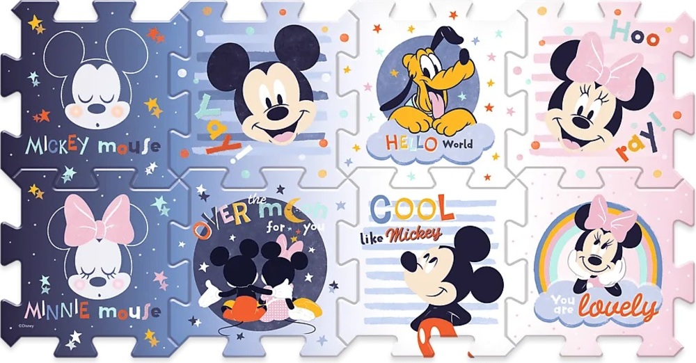 Puzzle Mickey Mouse je sada veľkých a mäkkých puzzle, vytvorená pre malých fanúšikov Disney rozprávok. Pomocou penových puzzle si môžete postaviť priestorové figúrky ako kocku či škatuľu alebo vytvoriť plochý obrázok s rozmermi 118 x 60 cm, ktorý vďaka dobrým izolačným vlastnostiam možno použiť ako mäkkú podložku. Hračka rozvíja zmysel pre pozorovanie a motoriku. Puzzle pena bola vyrobená bez použitia BPA, je bez zápachu, úplne bezpečná pre bábätká a 100% recyklovateľná.