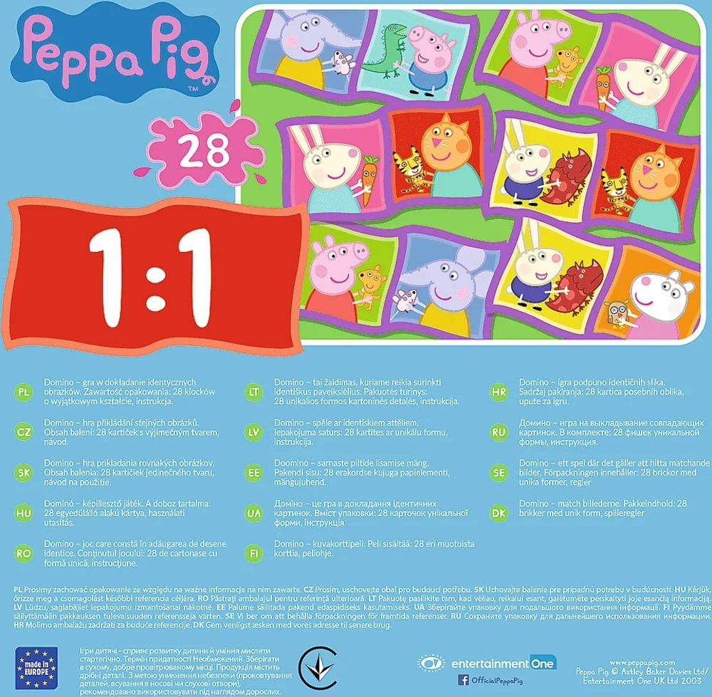 Domino je obľúbená hra pre deti, ktorá trénuje pamäť a vnímavosť, ktorá si získala srdcia hráčov po celom svete. Tentokrát vás do hry pozývajú postavičky rozprávky Prasiatko Peppa. Usporiadajte kartičky s ilustráciami a okami tak, aby susedné polia mali rovnaký počet ôk alebo rovnaký obrázok. Vyhráva hráč, ktorý sa najrýchlejšie zbaví svojich kariet alebo hru uzavrie usporiadaním karty, ktorá sa zhoduje s kartami vyloženými na oboch stranách. Rozloženie kariet je zakaždým iné, takže hra nikdy neomrzí a obrázky vašich obľúbených rozprávkových postavičiek spríjemnia každú hru! Domino je rodinná hra vytvorená pre malých milovníkov prasiatka Peppa, ktorá spočíva v pridávaní identických obrázkov s obrázkami rozprávkových postavičiek! Pre deti od 3 rokov