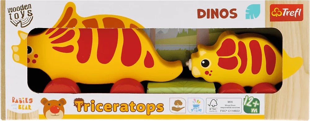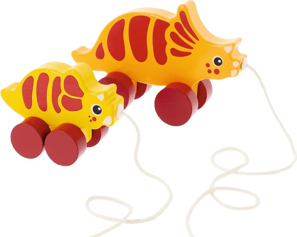 Dinos Triceratops - súprava dinosaurov na kolieskach so šnúrkami na ťahanie zavedie deti do fascinujúceho sveta. Táto rozkošná súprava obsahuje veľkého aj malého dinosaura pre dvojnásobnú zábavu! Veľký dinosaurus meria pôsobivých 9,9 cm x 16 cm x 5,5 cm, zatiaľ čo menší meria 6,7 cm x 10 cm x 5,5 cm. Oba dinosaury sú pripravené na dobrodružstvá na kolesách a pomocou šnúrok sa dajú ľahko viesť za vami.Vek: 1+