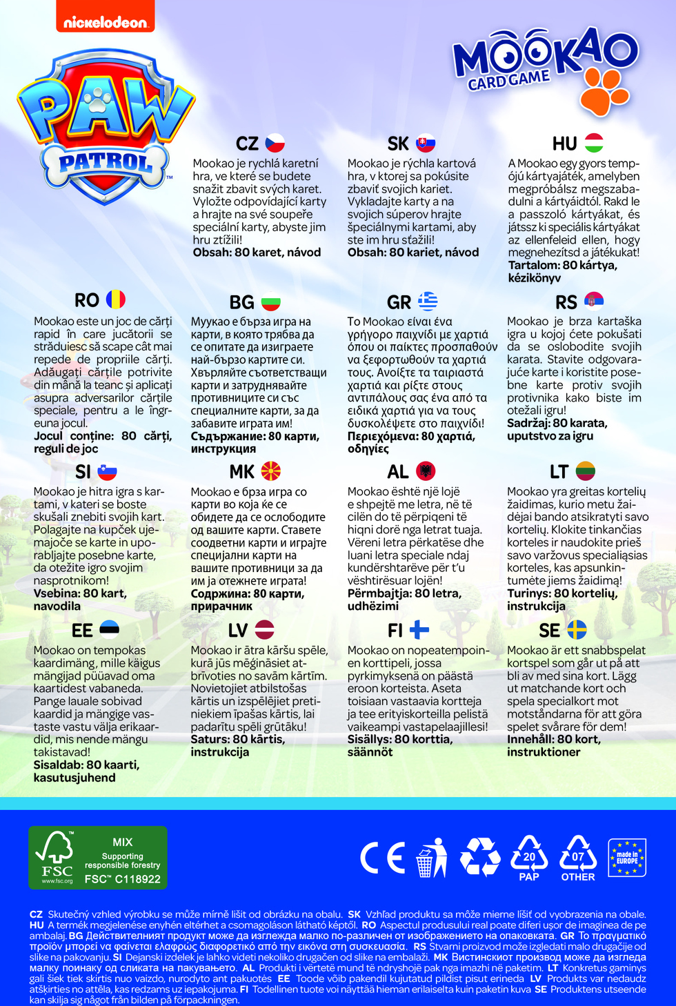 MooKao je dynamická kartová hra. Vašou úlohou je čo najskôr sa zbaviť svojich kariet z ruky. Ako na to? Vyložte zodpovedajúce karty a sťažte hru súperom tým, že na nich budete hrať špeciálne karty.Vek: 5+