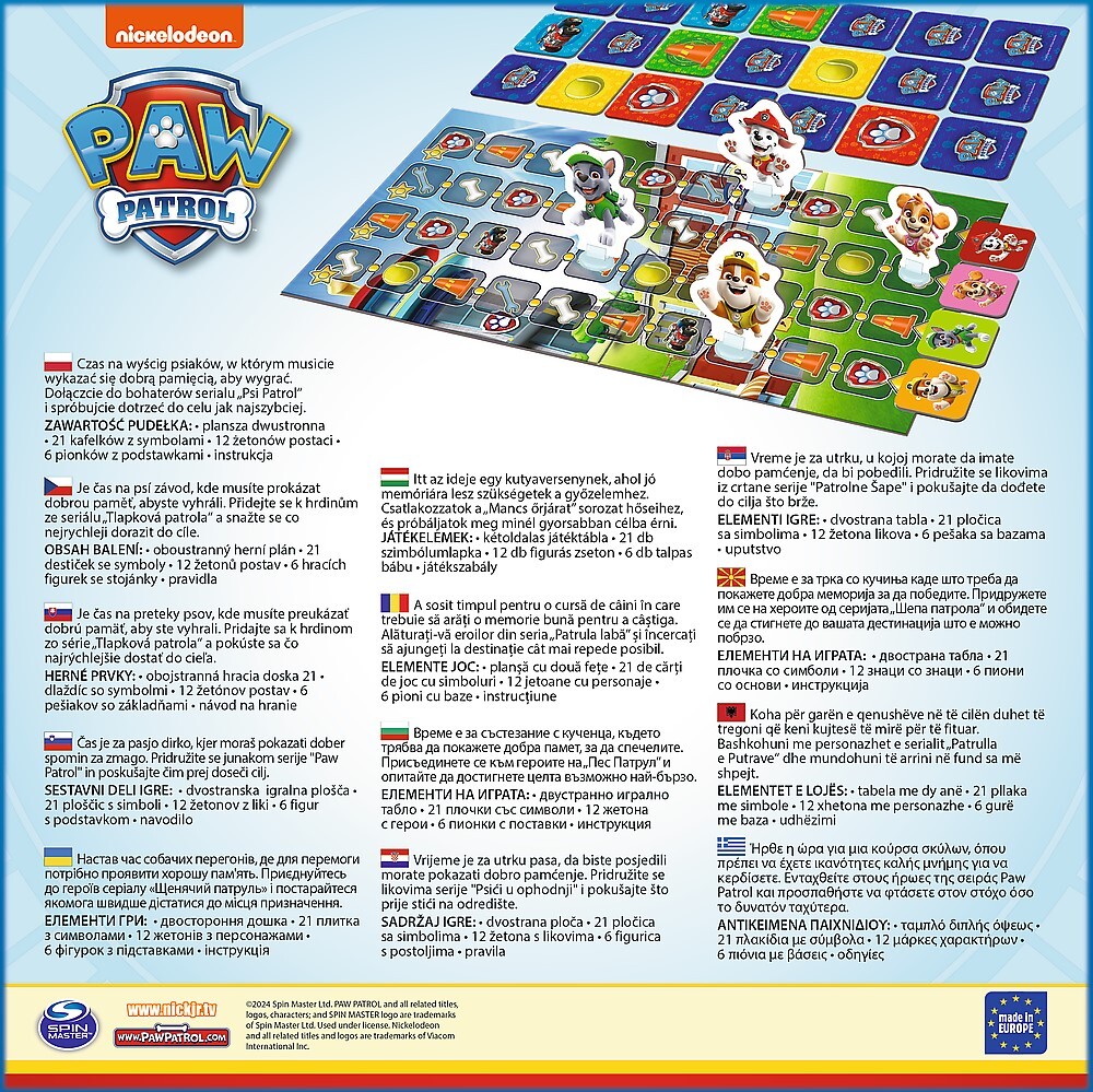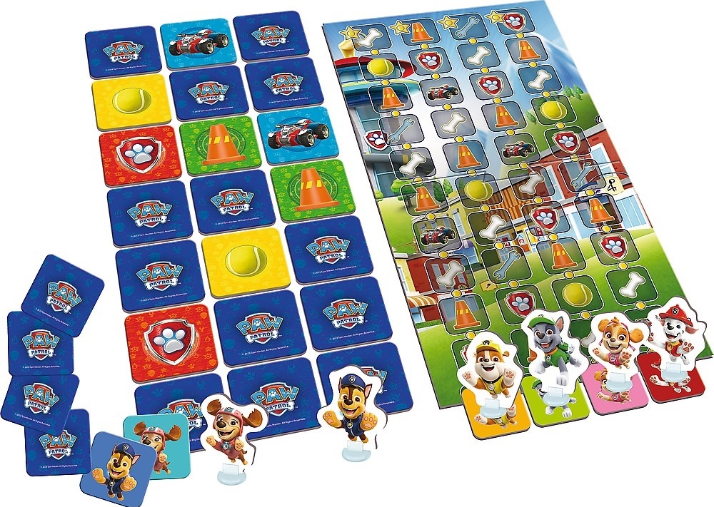 Pripojte sa k obľúbeným postavičkám Tlapkovej patroly a snažte sa čo najrýchlejšie dôjsť do cieľa. Využite svoju dobrú pamäť a cestujte po trase a hľadajte zhodu. Čím viac dvojíc nájdete, tým rýchlejšie váš psík dorazí do cieľa. Obsah balenia: obojstranná herná doska (2 herné varianty). 6 figúrok so stojanmi 21 kartičiek so symbolmi predmetov 12 žetónov postáv pravidlá hry