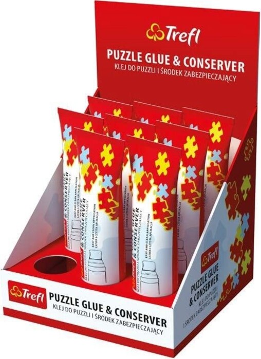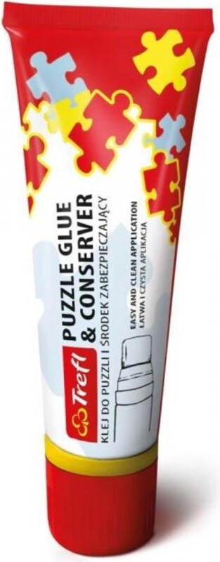 Trefl Lepidlo na puzzle, výrobca Trefl. Váš zrak bol na krivolakých dielikoch puzzle prilepený dlhé hodiny a teraz by ste hotovú skladačku mali zase vrátiť do krabice? Kdeže, pekne sa ňou pochváľte a vystavte si poskladaný obraz na stenu. Pomôže vám k tomu špeciálne lepidlo, ktorým dieliky prilepíte na papierovú podložku. Potom už len stačí zohnať rám zodpovedajúcej veľkosti a staviteľská trofej je na svete. Lepidlo obsahuje špongiu, pomocou ktorej sa lepidlo nanáša na puzzle zo strany s obrázkom. Tuba má objem 70ml, odporúčaná dávka je 15ml na 1000 dielikov, teda jedna tuba vystačí na puzzle o veľkosti 4000 dielikov, pre väčšie formáty teda zakúpte viac balení. Nevhodné pre deti do 3 rokov