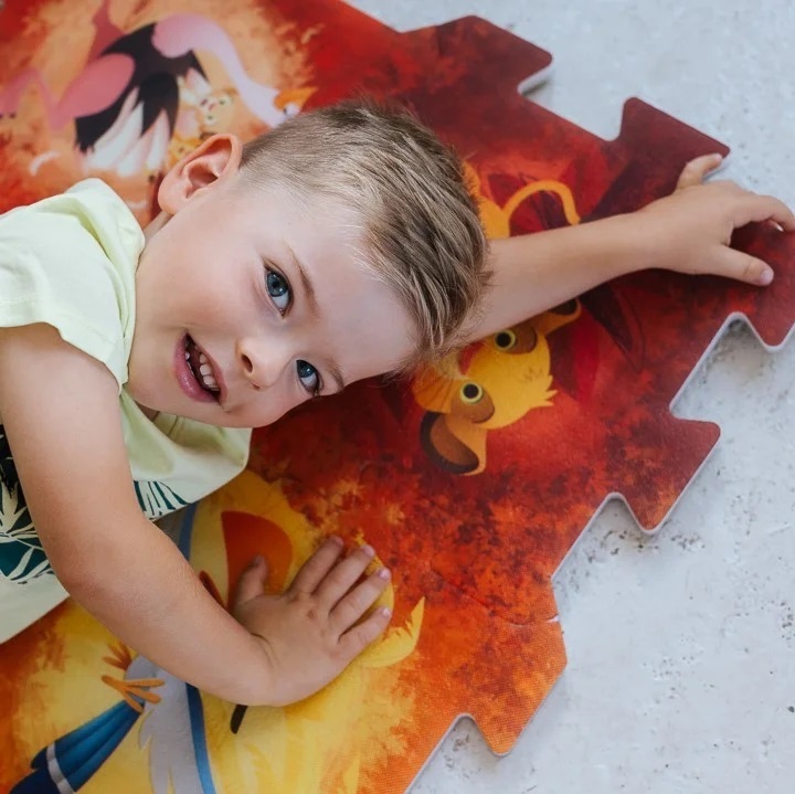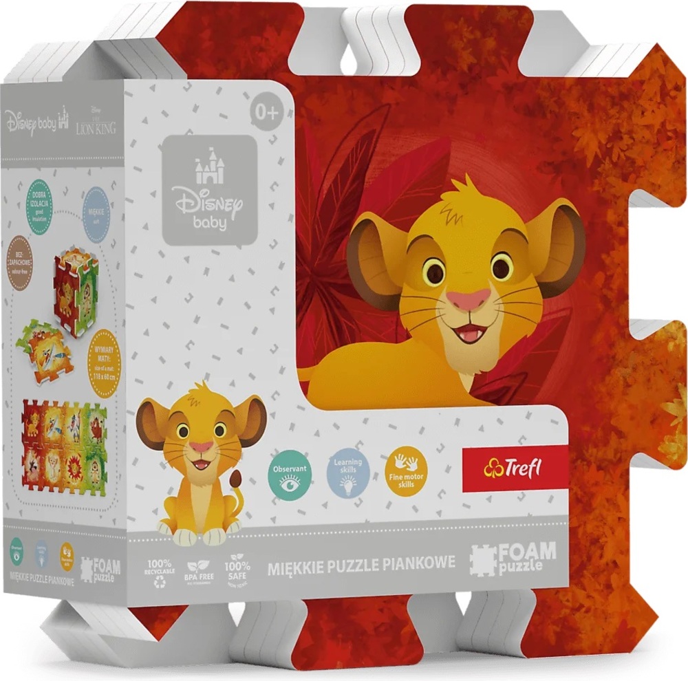Puzzle Leví kráľ je súprava veľkých a mäkkých hlavolamov, vytvorená pre malých fanúšikov kresleného filmu Disney. Pomocou penových puzzle si môžete postaviť priestorové figúrky ako kocku či škatuľu alebo vytvoriť plochý obrázok s rozmermi 118 x 60 cm, ktorý vďaka dobrým izolačným vlastnostiam možno použiť ako mäkkú podložku. Hračka rozvíja zmysel pre pozorovanie a motoriku. Puzzle pena bola vyrobená bez použitia BPA, je bez zápachu, úplne bezpečná pre bábätká a 100% recyklovateľná.