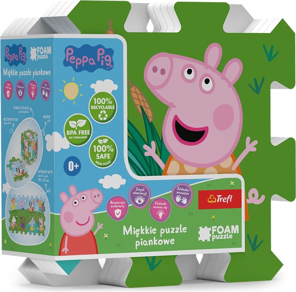 Puzzle Peppa Pig je súprava veľkých a mäkkých puzzle, vytvorená pre malých fanúšikov kresleného filmu Peppa Pig. Pomocou penových puzzle si môžete postaviť priestorové figúrky ako kocku či škatuľu alebo vytvoriť plochý obrázok s rozmermi 118 x 60 cm, ktorý vďaka dobrým izolačným vlastnostiam možno použiť ako mäkkú podložku. Hračka rozvíja zmysel pre pozorovanie a motoriku. Puzzle pena bola vyrobená bez použitia BPA, je bez zápachu, úplne bezpečná pre bábätká a 100% recyklovateľná.