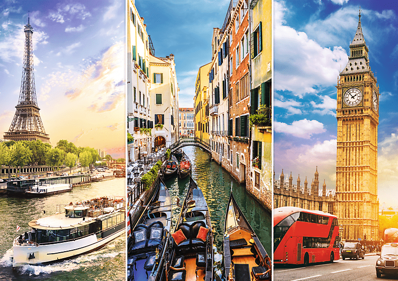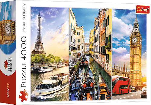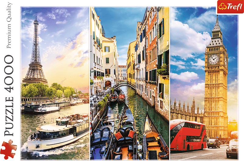 Trefl Puzzle 4 000 nájdete pohľad na tri európske mestá: Paríž, Benátky a Londýn Po položení sa vytvorí plagát s rozmermi 136 x 96 cm. Výrobok bol vyrobený z vysoko kvalitných materiálov pomocou špeciálneho kalandrovaného reflexného papiera, ktorý uľahčuje stohovanie.Produkt bol vyrobený v Poľsku a na výrobu boli použité ekologické materiály. Vek 16+