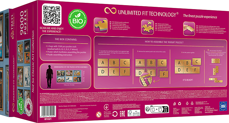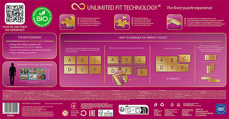 TREFL Unlimited Fit Technology (UFT) sú puzzle neobmedzených možností. Vďaka tejto technológií si môžete z viac obrázkov poskladať veľké puzzle koláže. technológia umožňuje napájanie ľubovoľného množstva puzzle motívov zo série UFT najvyššia kvalita - puzzle vyrobené z najsilnejšieho modrého kartónového podkladu každý dielik má unikátny tvar Puzzle dieliky držia pri sebe a poskladané obrázky je možné pohodlne premiestňovať rozmer: 198,6 x 92,8 cm 1 dielik: 1,4 cm Kadý obrázok balený samostatne 6x1500 dielikov. Balené v bio obale – bez vrchnej fólie. Sáčok vo vnútri je biologicky rozložiteľný.