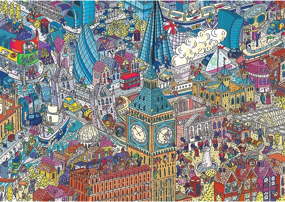 Eye-Spy UFT 1000- dielna séria umožňuje spojiť ľubovoľný počet hlavolamov do jednej koláže. Puzzle plagát Imaginary Cities vás zavedie do Londýna, kde je všetko možné. Nechajte sa prekvapiť množstvom detailov. Pozrite sa pozorne na každý obraz a nájdite scény plné humoru! Puzzle zo série Eye-Spy boli vyrobené pomocou technológie Unlimited Fit a kvality Trefl Prime. najhrubší puzzle kartón biodegradovateľná a kompostovateľná fólia na krabici vo forme nálepiek a ako sklzový vak možnosť kombinácie ľubovoľného počtu vzorov v skupine; vytvorte si vlastnú individuálnu koláž špeciálny, nepravidelný tvar puzzle zložitú hádanku je možné presúvať a dokončené hádanky sa nerozpadnú Vek: 12+