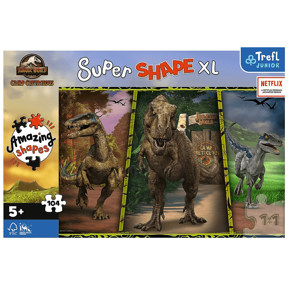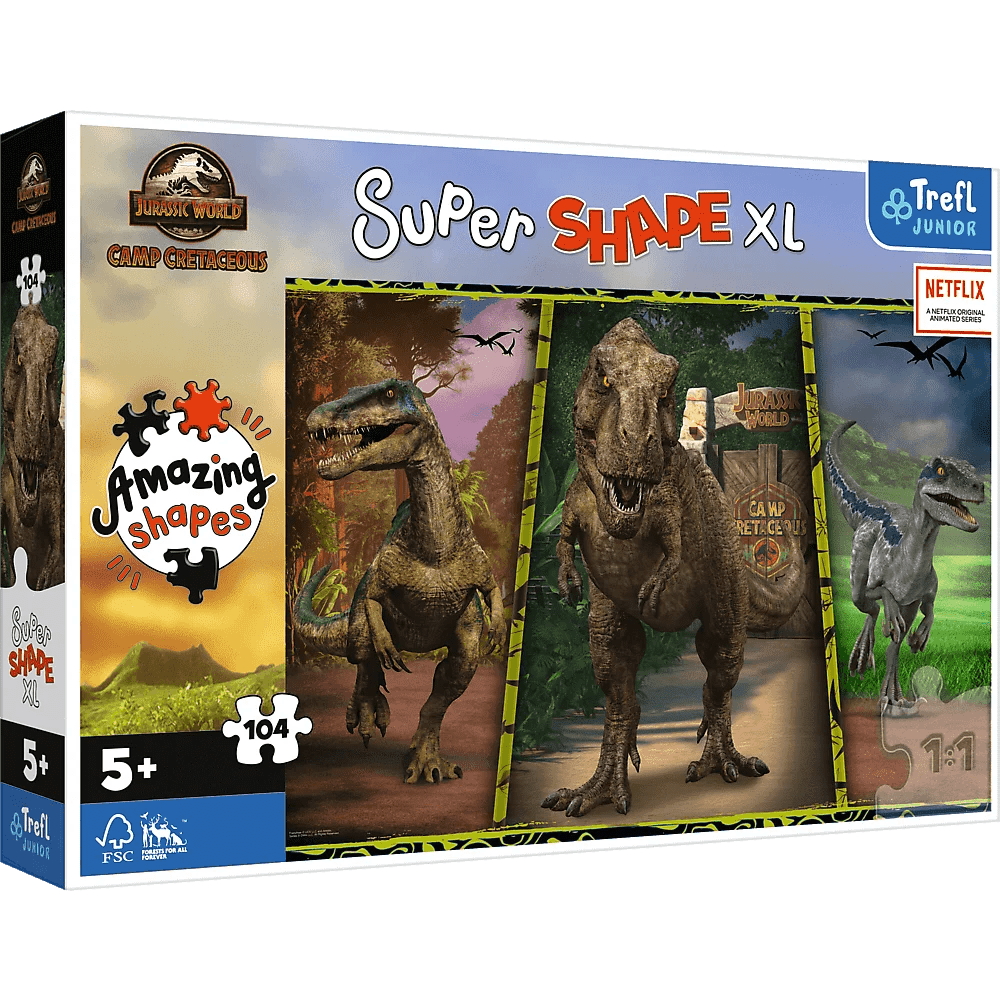 Farebné dinosaury sú puzzle, ktoré pozostávajú zo 104 veľmi veľkých dielikov, vrátane kúskov s netypickými tvarmi. Táto skladačka poteší malých nadšencov dinosaurov a fanúšikov animácie Jurský park: Kriedový tábor. Séria skladačiek SUPER SHAPE ponúka veľké skladačky s originálnymi tvarmi! Súčasťou balenia sú okrem štandardných dielikov aj špeciálne tvarované dieliky, ktoré deťom prinášajú ešte väčšiu radosť z ukladania! Vek 5+