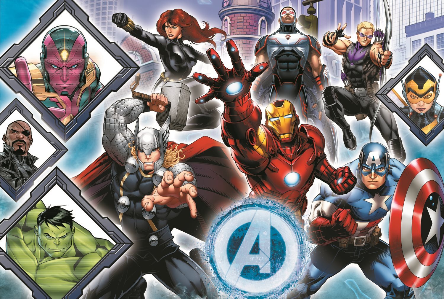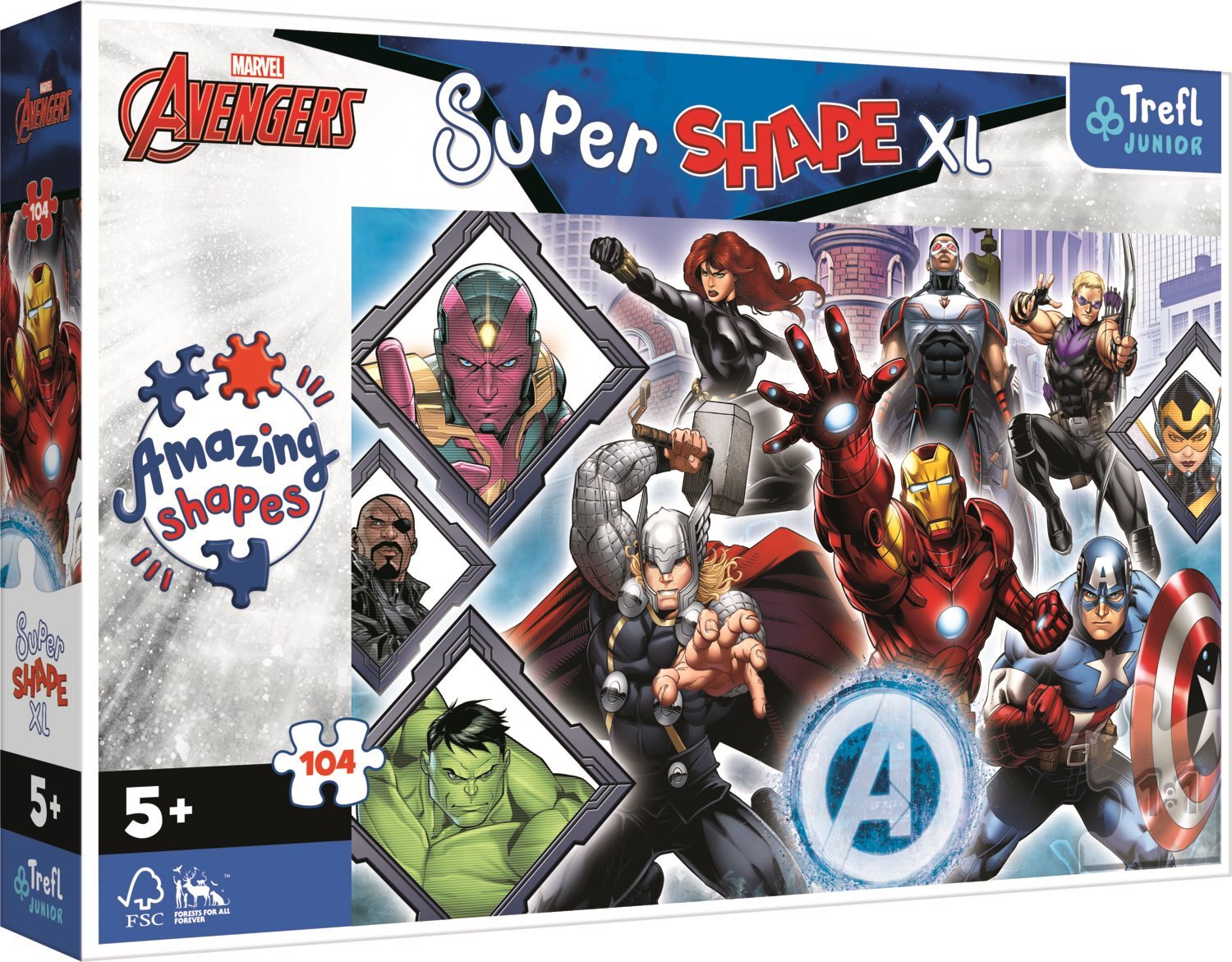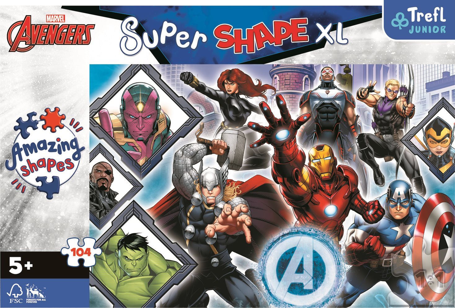 Puzzle s motívom obľúbených hrdinov Avengers. Puzzle obsahujú 104 veľkých dielikov neobvyklých tvarov, ktoré určite zabavia každého milovníka Marveloviek. Rozmer zloženého obrázku: 60 x 40 cm Rozmer krabice: 40 x 27 x 6 cm Vhodné od 5 rokov.