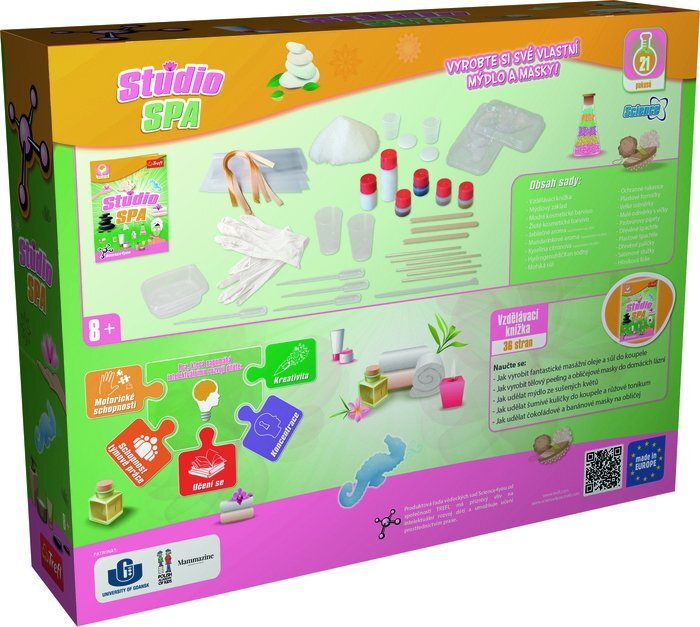 Trefl Science 4 U - Štúdio Spa - Kúpele, výrobca Trefl. Kreatívna sada pre prípravu relaxačných kúpeľných procedúr. Vaše deti si môžu vyskúšať výrobu najrôznejších kúpeľňových solí a tvárových masiek, a podporiť tak vlastné kreatívne myslenie Obsahuje: rukavice, nádoby, miešadlá, pipety a celý rad ingrediencií V balení deti nájdu 36 stranovú vzdelávaciu knižku a generátor nápadov a pokusov Katalógové číslo: 60538 Pre deti od 8 rokov