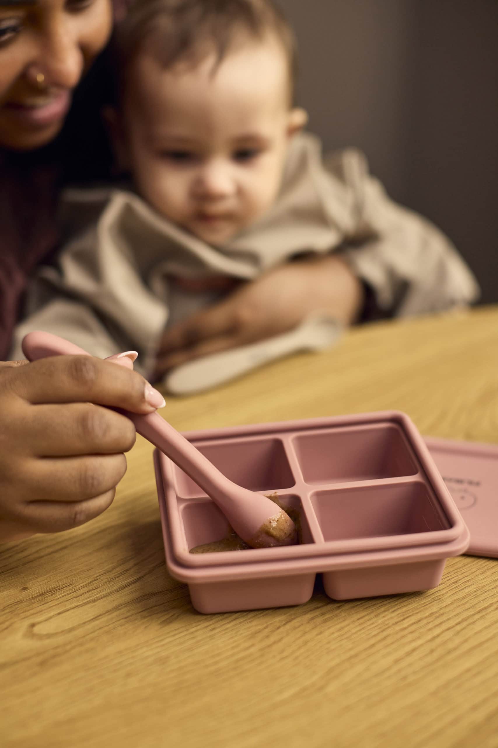 Navrhnuté s ohľadom na malé ústa, lyžičky majú mäkký silikónový povrch, ktorý chráni citlivé zúbky a upokojuje ďasná. Úzka hlavička lyžičky zaručuje pohodlné používanie, zatiaľ čo dlhá rukoväť je ideálna na kŕmenie a ľahké dosiahnutie do pohárov s detskou výživou. Sú vyrobené z potravinárskeho silikónu v kvalite LFGB s vnútorným plastovým jadrom pre väčšiu stabilitu, možno ich umývať v umývačke riadu a sú vhodné na každodenné používanie.