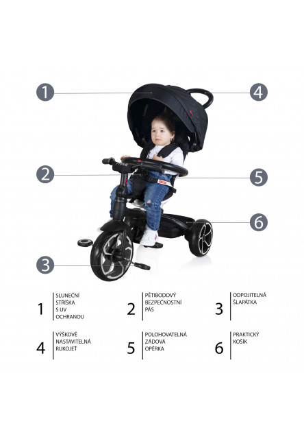 • Luxusný vzhľad• Možnosť jazdy po a proti smeru• Jednoduché otáčanie bez nutnosti demontovať akejkoľvek časti• Mäkké polstrovanie• Strieška s UV ochranou• Odpojiteľné pedále a riadidlá• Výškovo nastaviteľná rukoväť• Brzda• Polohovanie chrbtovej opierky• Praktický košík na drobnosti• Nosnosť 25kg dieťaťa