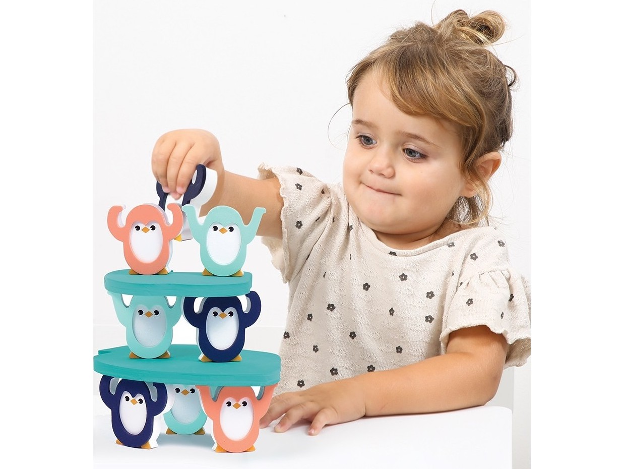 Zábavnou sadu hraček do vody tvoří dvě plovoucí plošiny a 8 roztomilých tučňáků, kteří na plošinách balancují. Tučňáky je možné stavět různými způsoby na sebe a vytvářet z nich pyramidy. Po namočení tučňáci drží přilepení na vaně. Nebo je postavte do řady za sebou a nechte je padat jako domino. Hračka je vhodná nejen pro hraní ve vodě, ale i na na stole či na zemi.