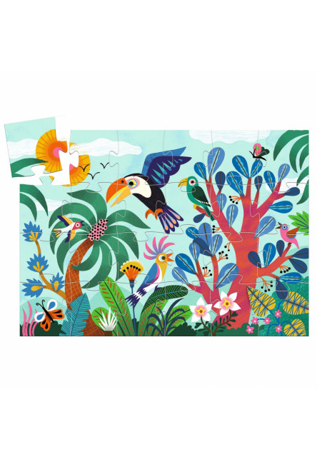Puzzle pre predškolákov. Zobrazuje tukana v pestrofarebnej džungli. Ilustrácie: Magali Attiogbé. Ve...zobrazit více