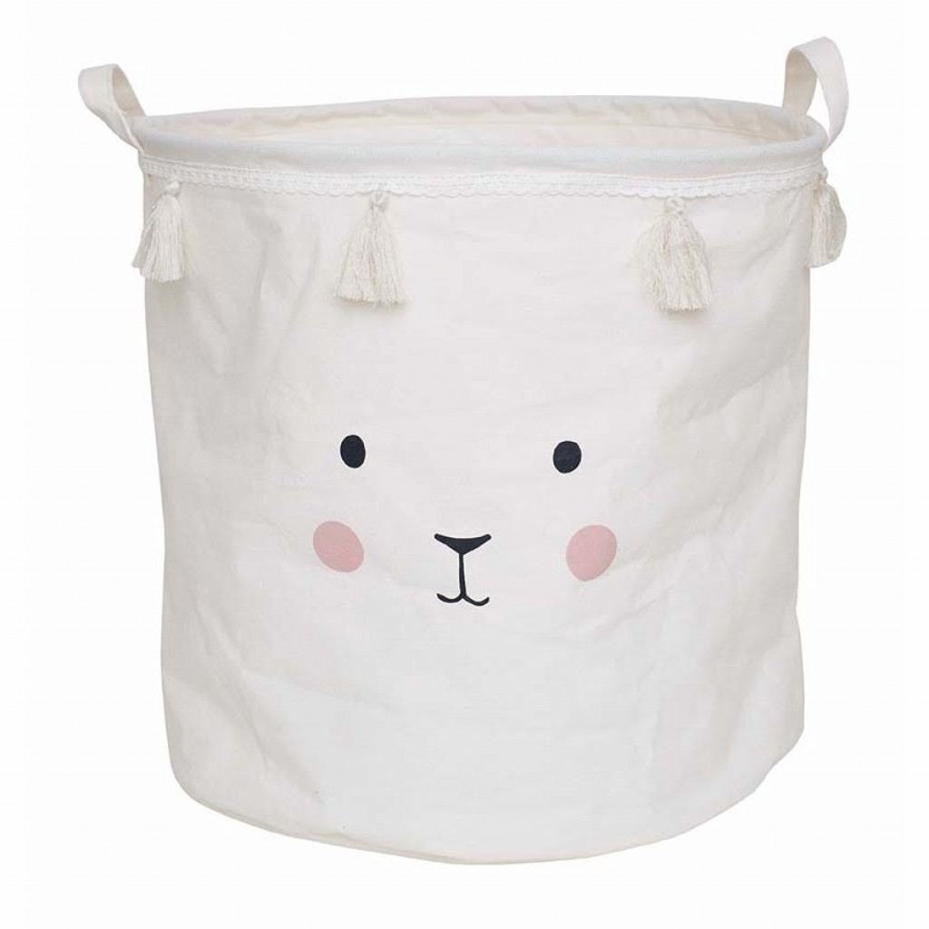 Tento výrobek je z části vyroben z recyklovaného materiálu a barva textilu se proto může mírně lišit. Na jedné straně košíku je roztomilá tvářička zajíčka.