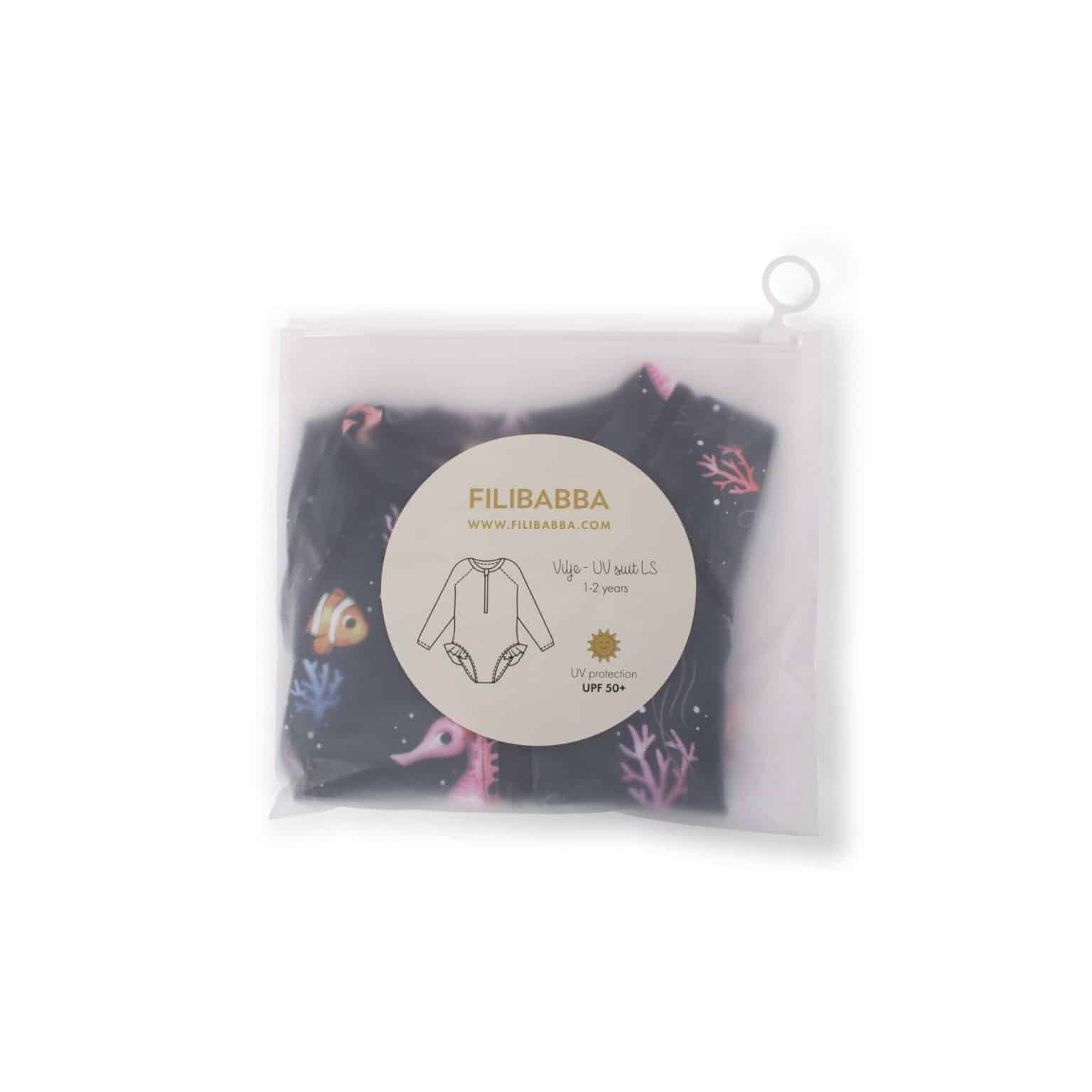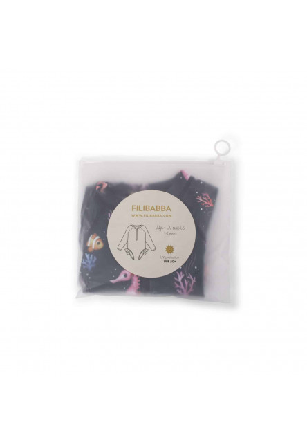 S očarujúcim UV oblekom FILIBABBA pre deti budú slnečné dni pri bazéne, na pláži alebo v záhrade ešte zábavnejšie! Skvelý UV oblek s dlhými rukávmi a najroztomilejšou volánovou sukňou ponúka UV 50+ ochranu a je príjemný na jemnej pokožke dieťaťa. UV oblek poteší deti každého veku fantastickými, ručne kreslenými ilustráciami. Vyberte si medzi elegantnými morskými koníkami, bublinkovými korytnačkami a lahodnou zmrzlinou a vodná zábava môže začať! Ako sa starať o plavky: Po každom kúpaní dôkladne umyte UV oblek pod tečúcou vodou. UV oblek vždy nechajte vyschnúť v tieni. Inštrukcie na používanie: UV ochrana vašich plaviek sa môže časom alebo natiahnutím plaviek znížiť. Svetlé farby môžu časom vyblednúť v dôsledku priameho slnečného žiarenia alebo kontaktu s vysoko chlórovanou vodou.