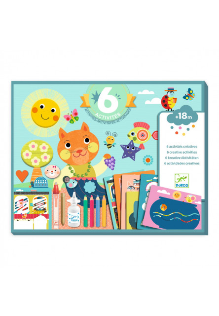 4 ilustrované kruhy z hrubého kartónu s otvormi. 20 x 50 cm prameňov vlny. 5 farieb. 1 ihla. 1 pár nožníc. 1 návod.