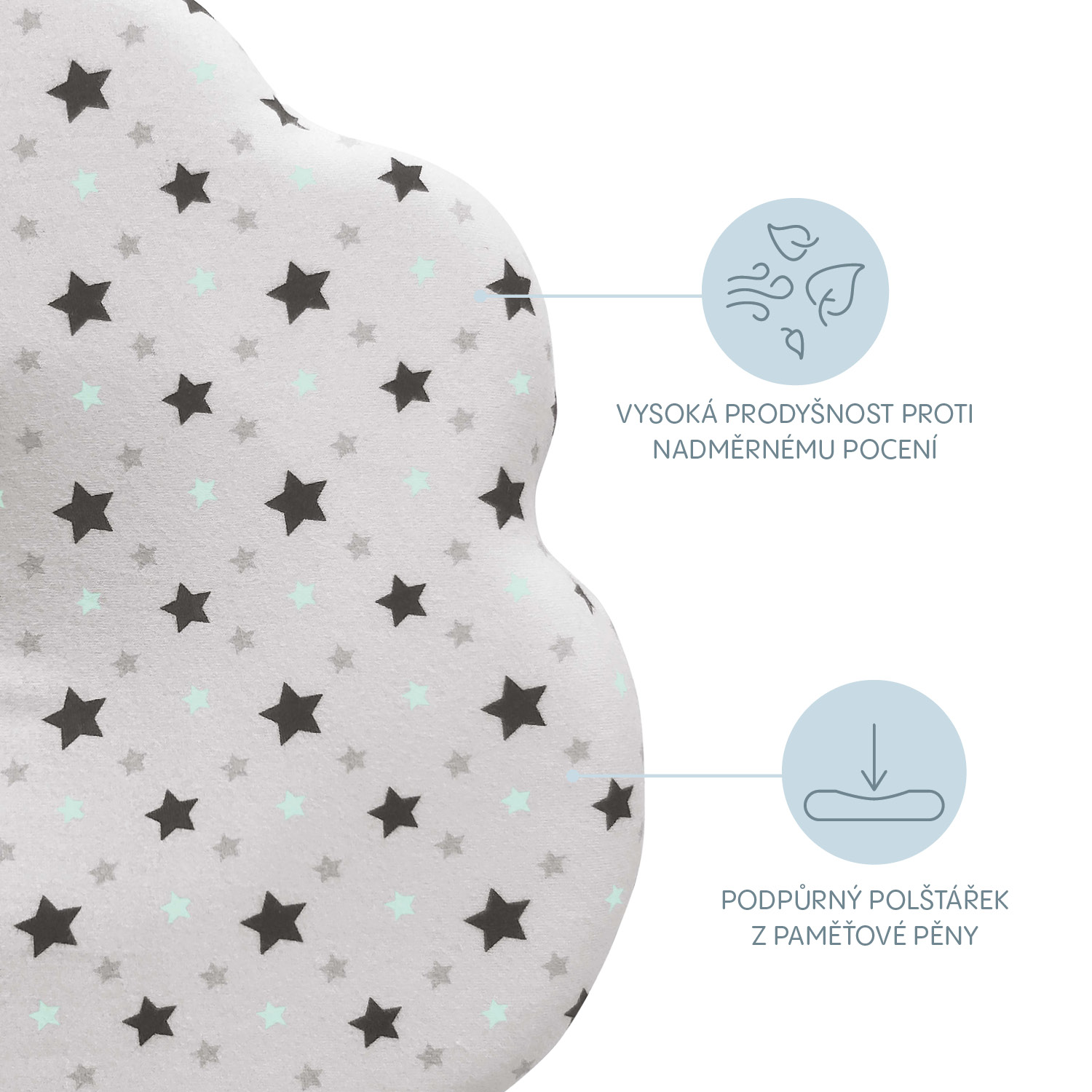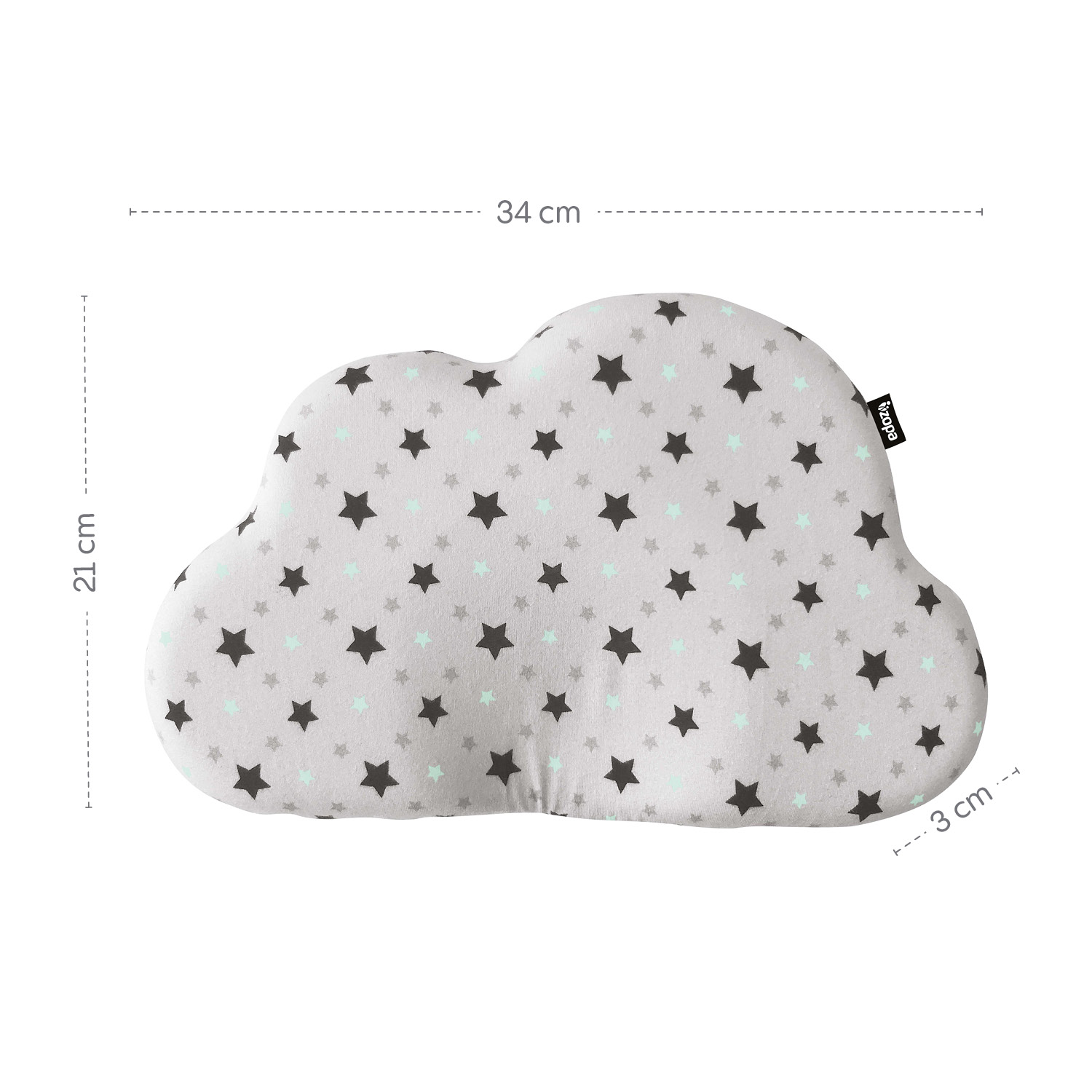 • Kvalitný látkový poťah • Tvar mraku s potlačou hviezdy v mätovej farbe• Chráni pred vznikom syndrómu plochej hlavy• Univerzálne použitieRozmery(D x V x H): 35 x 22 x 3 cm
