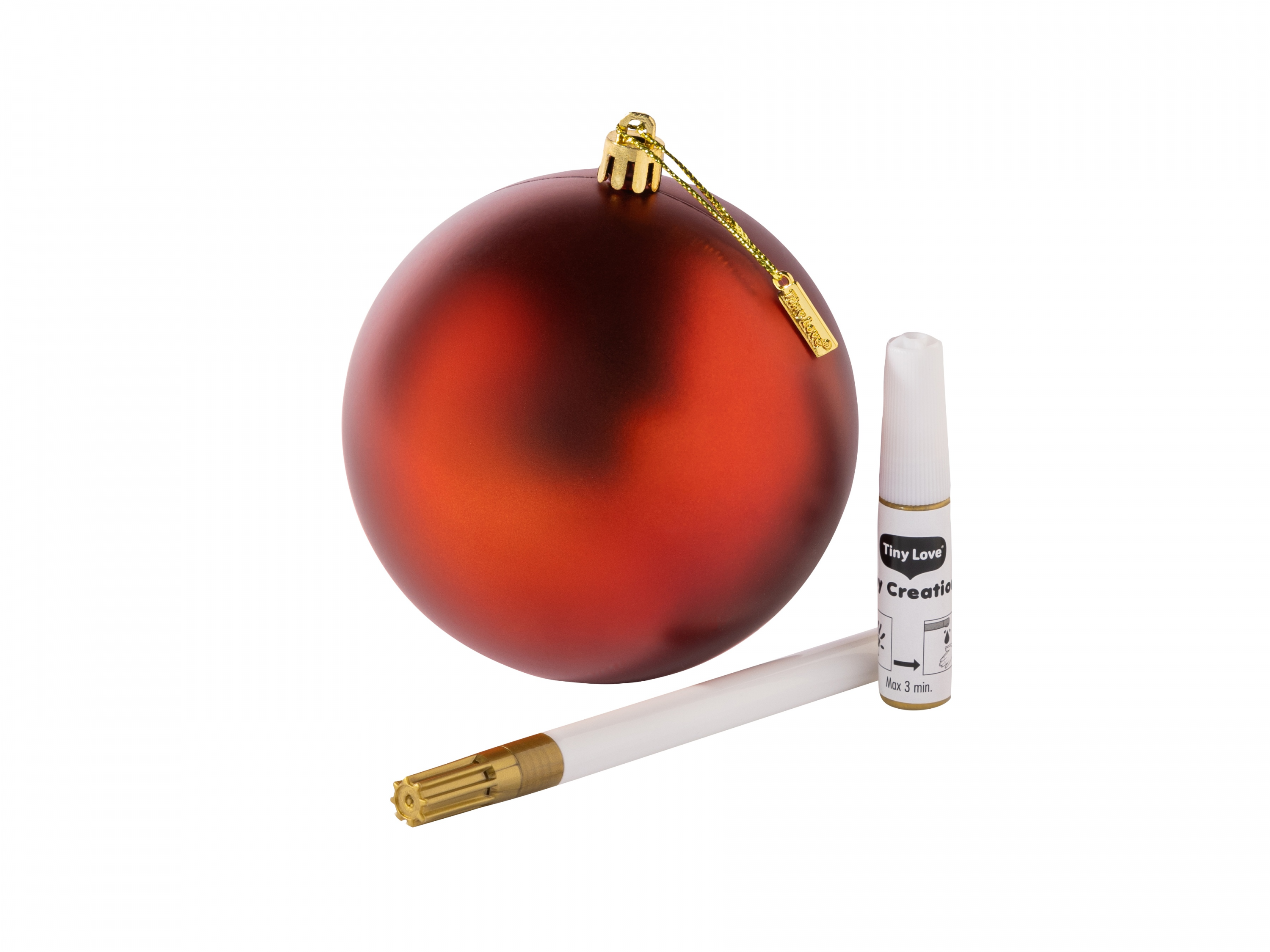 Obsah balení: vánoční koule z vysoce kvalitního plastu, zlatá barva v tubě (dermatologicky testovaná), zlatý fix, návod krok za krokem