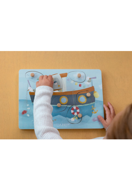 Poznávejte spolu s vaším dítětem, kdo doprovází loď na moři a jaké zvuky se na moři ozývají. Když dítě vloží správný tvar do otvoru na herní desce, ozve se např. hlas racka nebo zahoukání lodi.