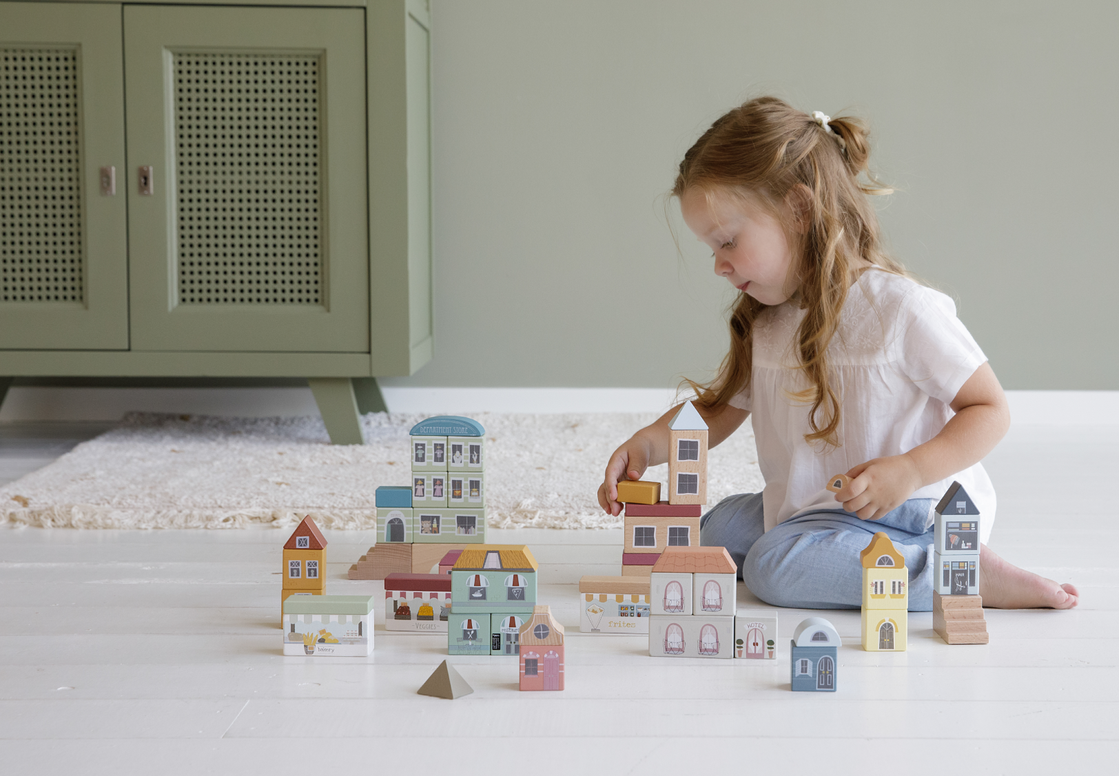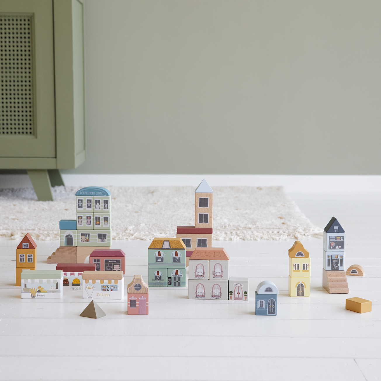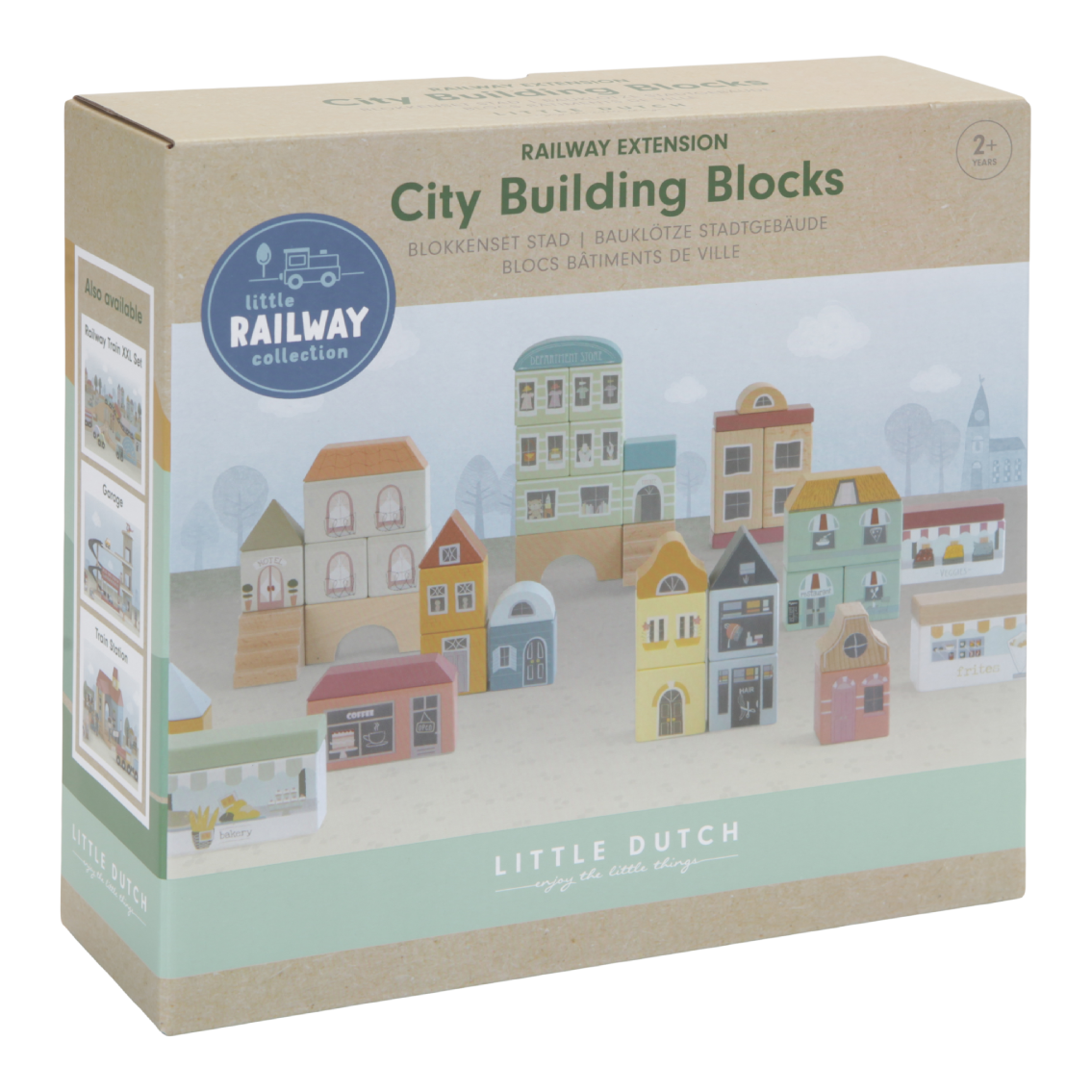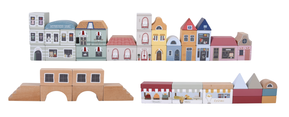 Dřevěné město je krásným doplňkem k Little Dutch dřevěné vláčkodráze XXL. Sada obsahuje 50 kostek, ze kterých můžete vytvořit různé budovy jako obchody, hotel či restauraci. Dřevěné kolejnice nejsou součástí sady.