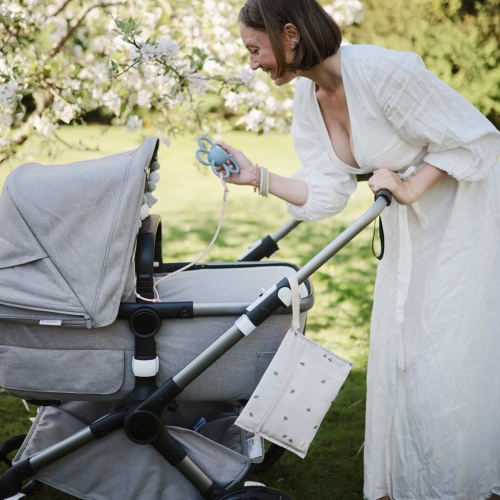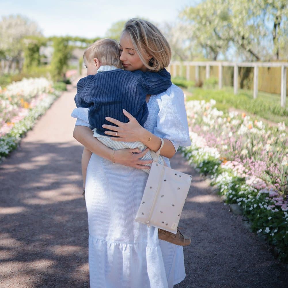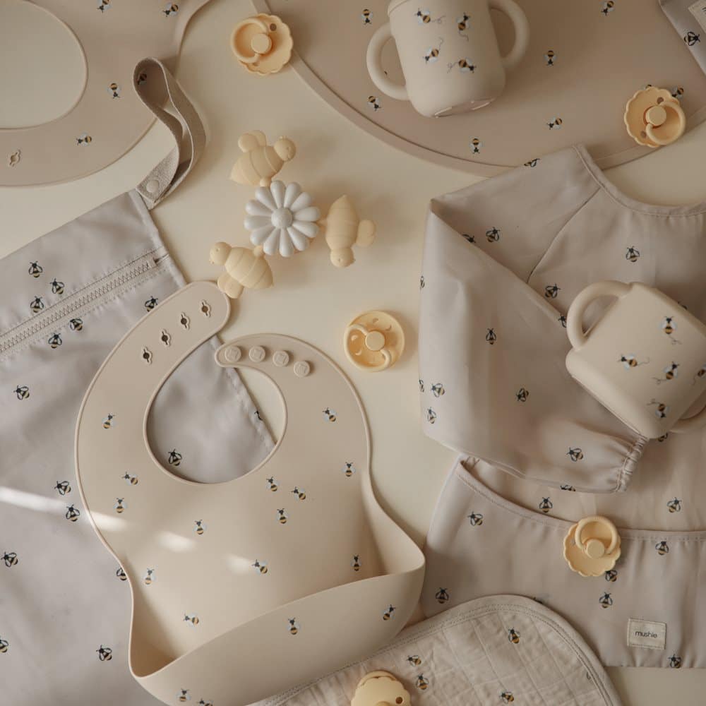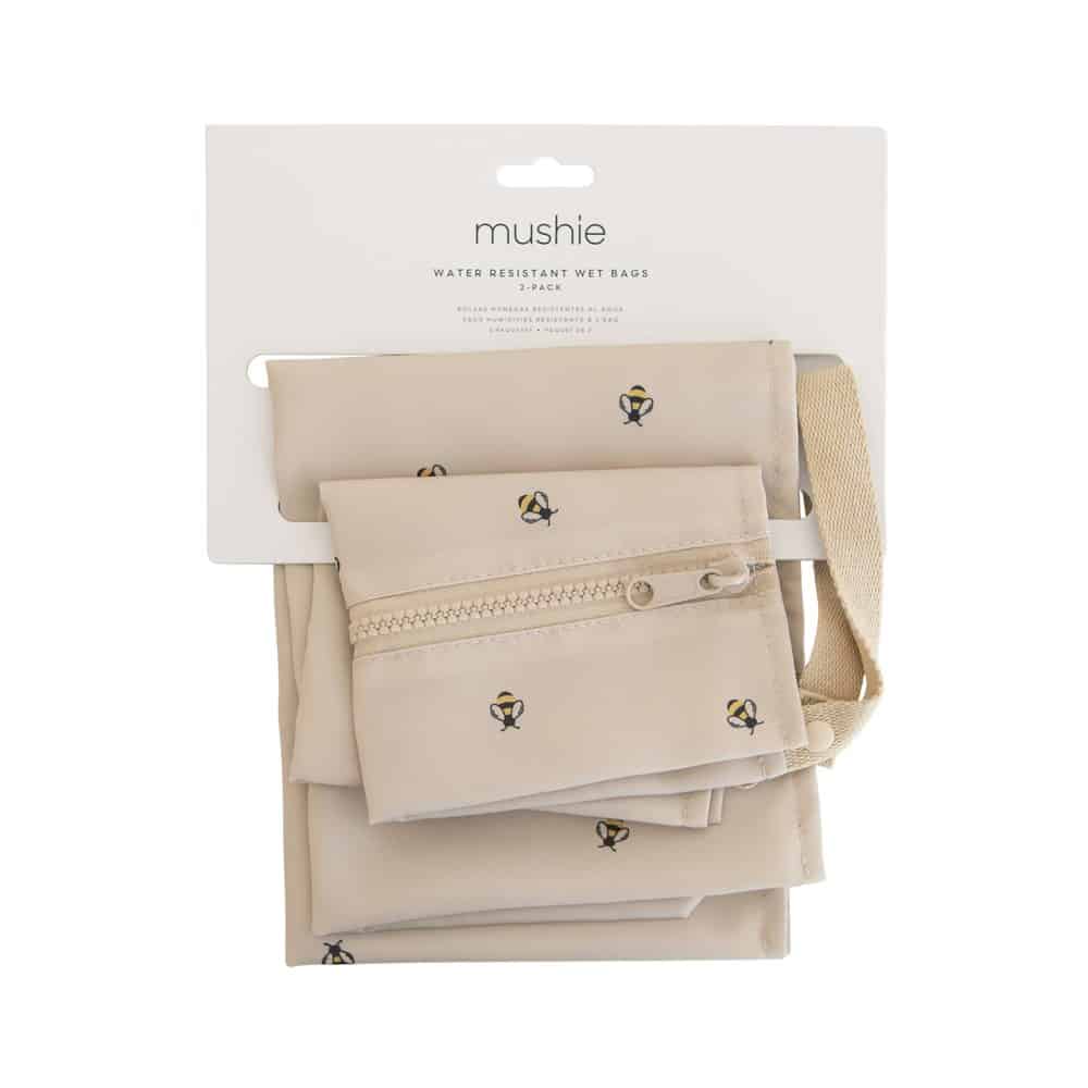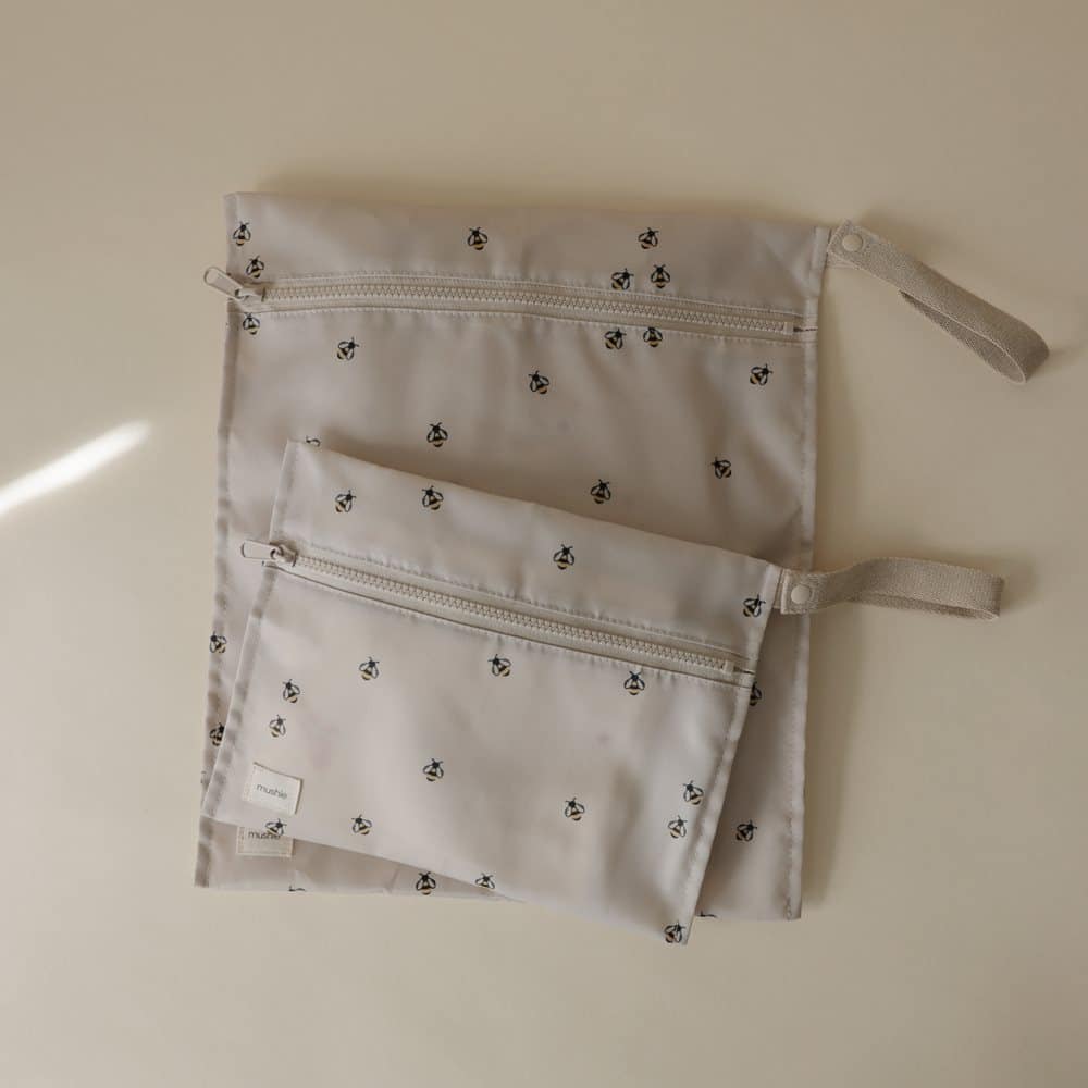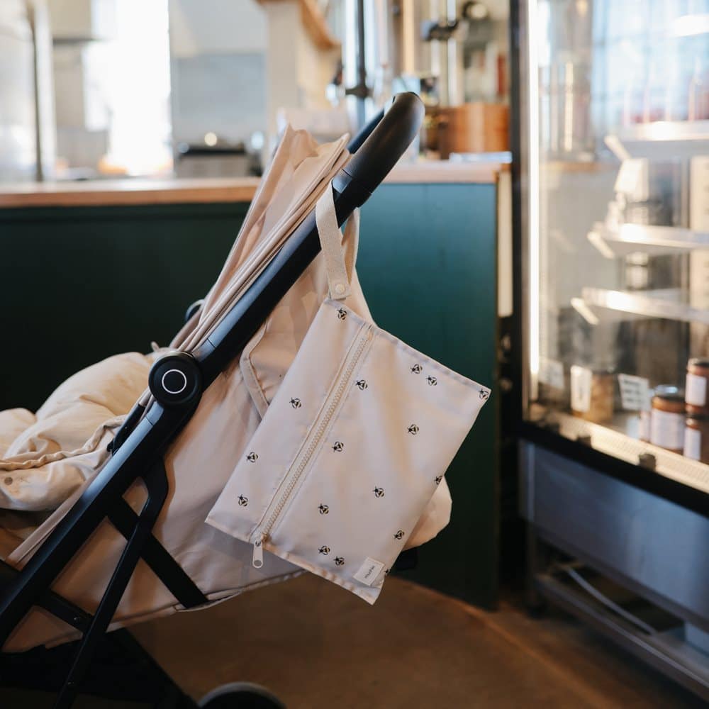 Tieto nepremokavé vrecká sú vybavené zapínaním na zips a sú vyrobené z vodeodolného materiálu, ktorý je možné prať v práčke. Sú navrhnuté tak, aby pomohli zvládnuť neporiadok na cestách. Rúčky majú patentný uzáver na jednoduché zavesenie alebo pripevnenie na kočík. Mäkká neutrálna základňa je zdobená jemným vzorom včely po celej ploche, ktorý dodáva hravý, no nadčasový dizajn, ktorý sa krásne hodí do každodenného rodinného života.
