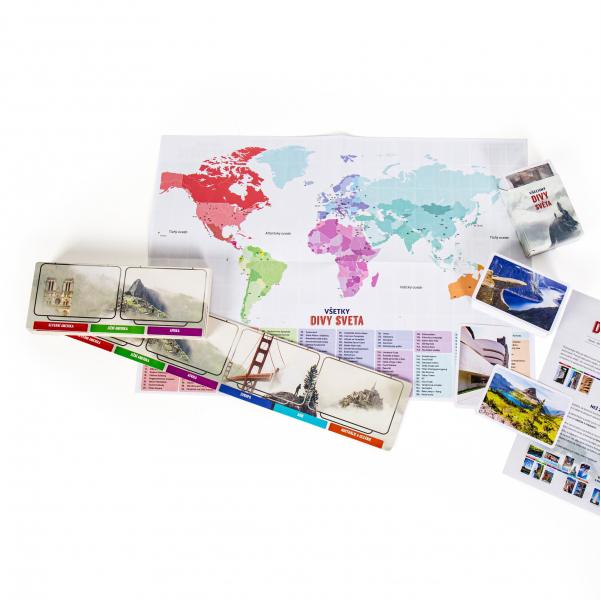 Naša planéta je plná neuveriteľných miest – od zázrakov prírody po úžasné stavby vybudované ľuďmi. Vydajte sa na cestu okolo sveta a spoznajte jedny z najúžasnejších divov našej planéty! Pokúste sa pomenovať div sveta vyobrazený na kartičkách a určiť, kde sa nachádza a aký je jeho účel. Za správnu odpoveď získate kartu, ktorú potom umiestnite na kontinentálnu dosku. Za každú kartu umiestnenú na správny kontinent získavate bod. Víťazom je hráč s najvyšším počtom bodov! S kartami zobrazujúcimi 195 divov sveta zo 6 rôznych kontinentov bude učenie zábavou. HERNÝ MECHANIZMUS Každý hráč vyloží na svoju kontinentálnu kartu štyri karty divov sveta z balíčka s otázkami fotografiou nahor. Hráč, ktorý je na ťahu, si vyberie jednu kartu z kontinentálnej karty ktoréhokoľvek protihráča. Ak identifikuje div sveta len pohľadom na fotografiu, získava túto a dve ďalšie karty z bodovacieho balíčka. Ak k správnej odpovedi potrebuje jednu pomôcku, získava okrem tejto karty iba jednu z bodovacieho balíčka. Ak budete potrebovať dve pomôcky, získavate len kartu divu sveta. Všetky karty, ktoré počas hry získate, musíte ešte navyše zaradiť pod správny kontinent na hracej karte. Hrá sa dovtedy, kým sa neminú karty z balíčka s otázkami. Na konci hry sa spočítajú správne zaradené karty a kto ich bude mať najviac, vyhráva. OBSAH HRY 195 kariet s divmi sveta 6 kontinentálnych kartičiek mapu sveta pravidlá PARAMETRE PRODUKTU Rozmery krabice: 16 cm x 4 cm x 22 cm