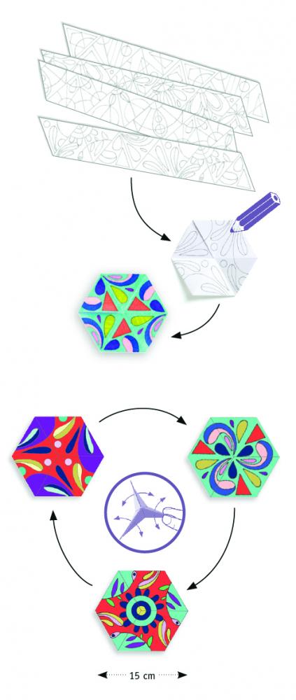 Sada Ružicové mandaly v sebe spája vyfarbovanie, skladanie a hru. Obsahuje 4 papierové prúžky so vzormi na vyfarbenie. Vyfarbené prúžky poskladáš do šesťuholníka, ktorý má farebnú nielen vrchnú a spodnú stranu, ale aj vnútornú. Zatlačením jednotlivých čas