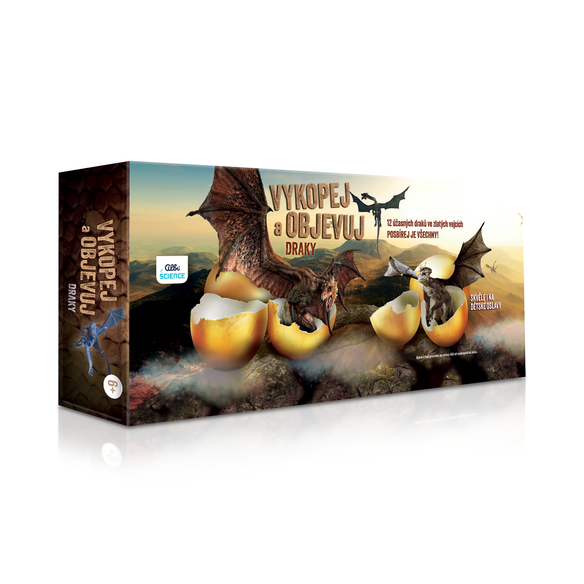 Jedinečná sada Vykop a objavuj - Draky od Albi Science skrýva 12 zlatých vajec s prekvapením v podobe dračích figúrok. Každá figúrka je úplne odlišná. Cena je uvedená za 1 ks vajcia. Sada Vykop a objavuj - Draky obsahuje: 12 sadrových vajec s figúrkami, 12 malých nástrojov.