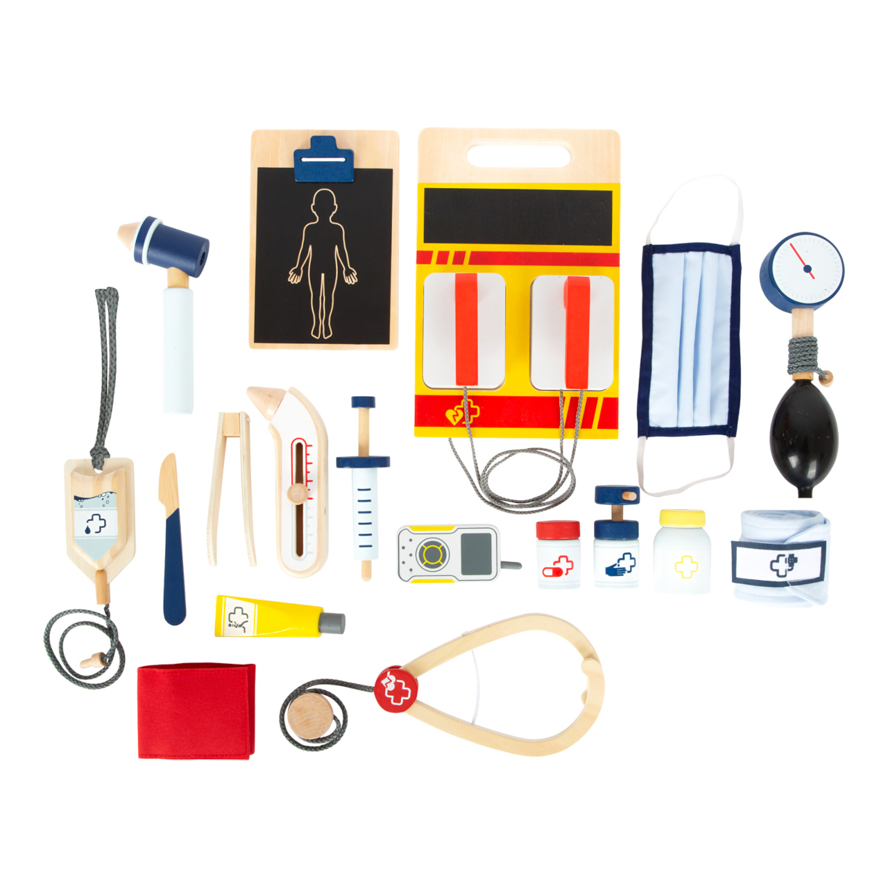 Všetko pre naliehavé prípady! Tento realistický batoh pre záchranárov má jasné farby, nastaviteľné popruhy a mladí záchranári v ňom nájdu všetky „ozajstné“ lekárske pomôcky. Dvojitý zips a vnútri elastické vrecká ponúkajú veľa úložného priestoru a rýchly prístup k záchranárskym pomôckam z pevného dreva. Najlepšími doplnkami sú zrejme tlakomer s manžetou a balónikom, otoskop s lupou a defibrilátor s tabuľkou pre kriedu. Tento inovatívny a obsiahly set lekárskych hračiek obsahuje mnoho „naozajstných“ lekárskych nástrojov a prístrojov, s ktorými si deti naozaj vyhrajú, to všetko v jednom batohu. Ďalej v batohu nájdete teplomer, detské textilné rúška, ampulky s otvorom pre vloženie striekačky pre prípad núdze, dezinfekčný sprej s pumpičkou, infúziu, náplasti na suchý zips, stetoskop, injekčnú striekačku s pohyblivým mechanizmom, skalpel, pinzetu a rádio. S týmito pevnými hračkami môžu deti objavovať a skúšať, aké je to byť záchranárom. Ilustrácie na lekárskych pomôckach deťom poradia rozoznať nástroje a tiež im možno zjednoduší ich použitie. Hlavné vlastnosti:tlakomer s manžetou a balónikom, možno tiež použiť pre zaistenie infúzieotoskop s ozajstnou lupouteplomer s nastaviteľnou teplotouznovu použiteľné a prateľné detské textilné rúškadefibrilátor s kriedou pre zaznamenanie srdcového tepuďalšie vybavenie: ampulky s otvorom pre vloženie striekačky pre prípad núdze, dezinfekčný sprej s pumpičkou, náplasti na suchý zips, fľaštička na lieky so skrutkovateľným viečkom, injekčná striekačka s pohyblivým mechanizmom, stetoskop, skalpel Ocenenia hračky:ToyAward 2022