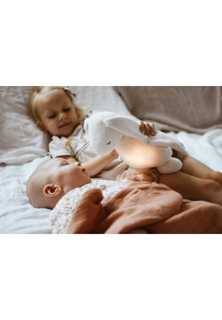 Bříško zajíčka svítí a slouží jako noční světlo s výběrem sedmi barev svícení. Jemné světlo pomáhá dítěti cítit se v postýlce bezpečně. Světlo je možné zapnout i bez zvuků. Při zapnuté funkci Shake světlo zapnete zatřesením hračkou. Zajíček se při svícení nijak nezahřívá a je pro dítě zcela bezpečný.