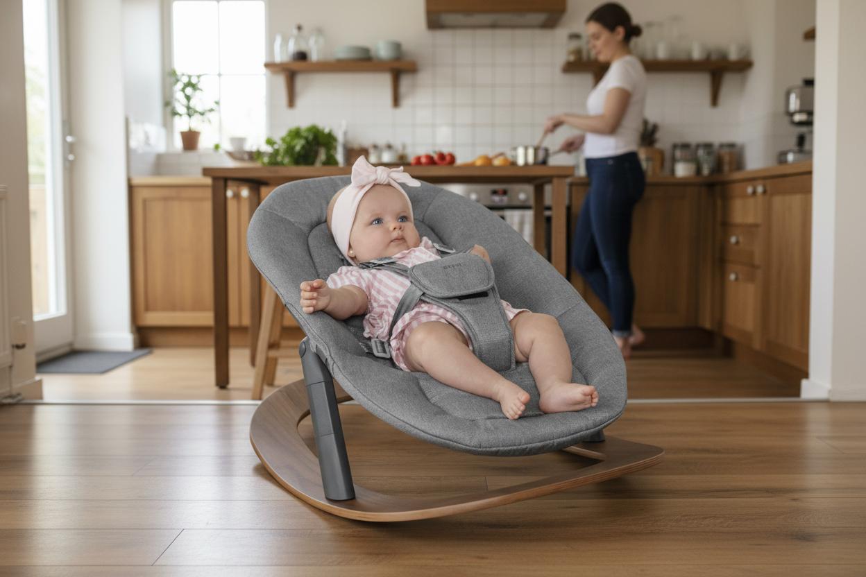 Štýlová hojdacia základňa premení novorodenecký set na pohodlné ležadlo pre bábätko. Jemné kolísanie upokojuje a podporuje prirodzený rytmus oddychu – ideálna od narodenia do cca 9 kg.