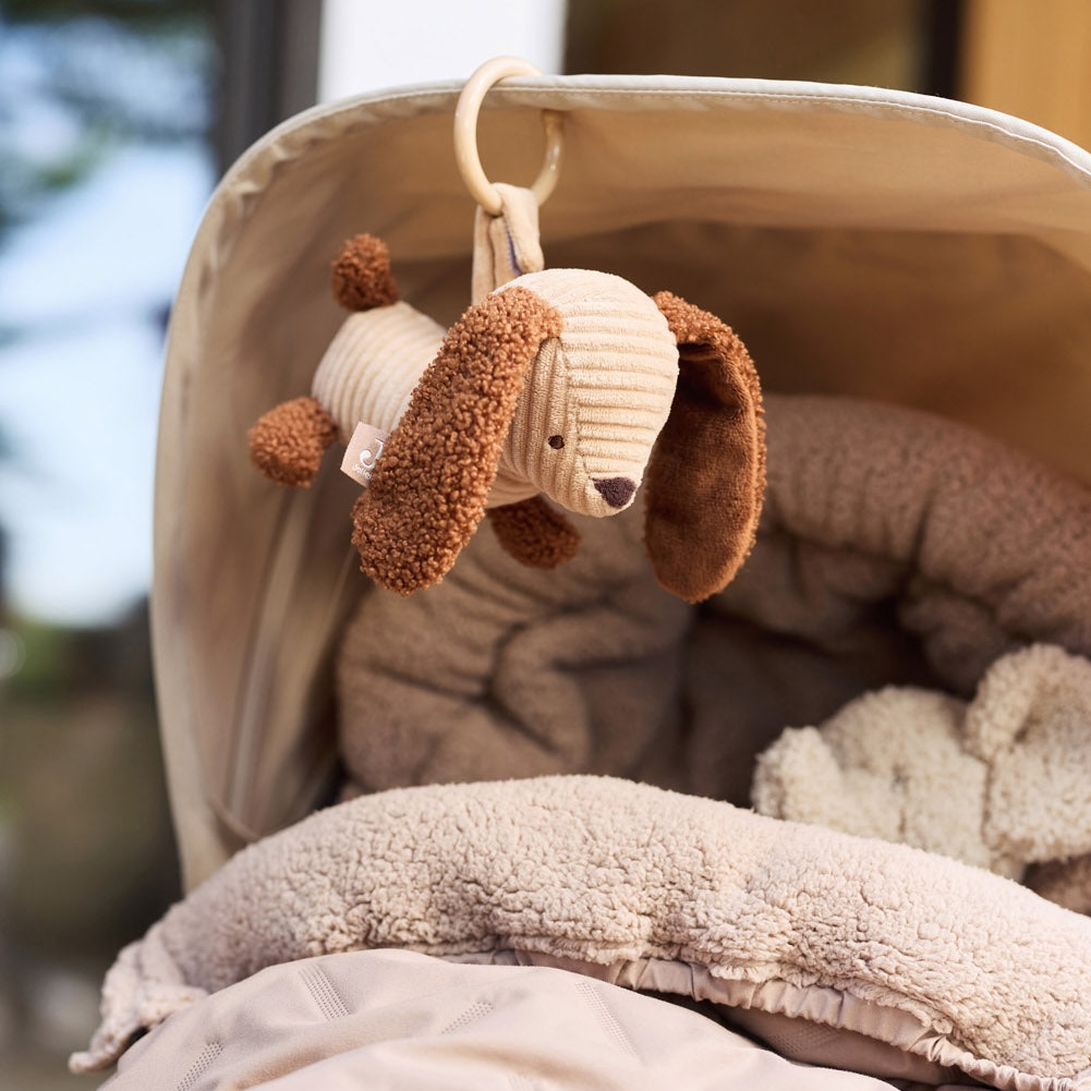 Roztomilý závěsný pejsek Diego z měkké žebrované látky s buklé detaily je ideálním společníkem pro vaše miminko na procházkách a výletech. Díky plastovému kroužku jej snadno připevníte na kočárek nebo autosedačku.