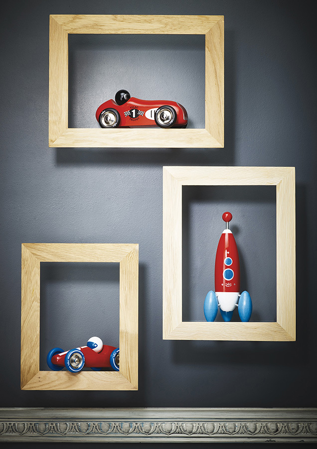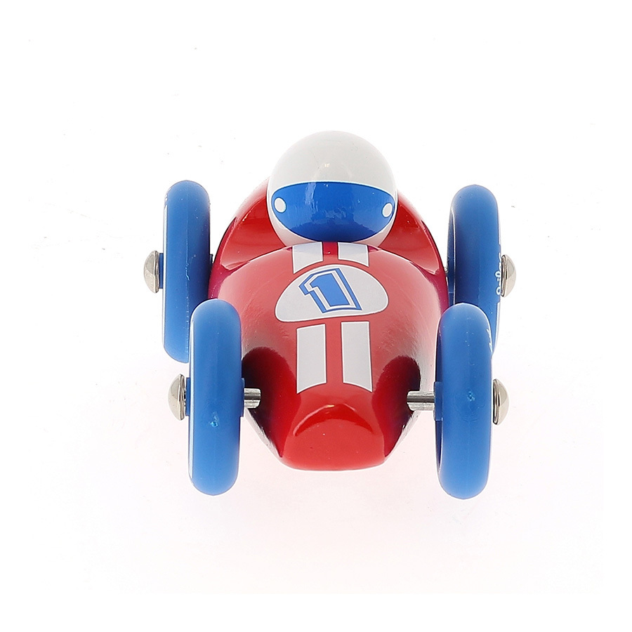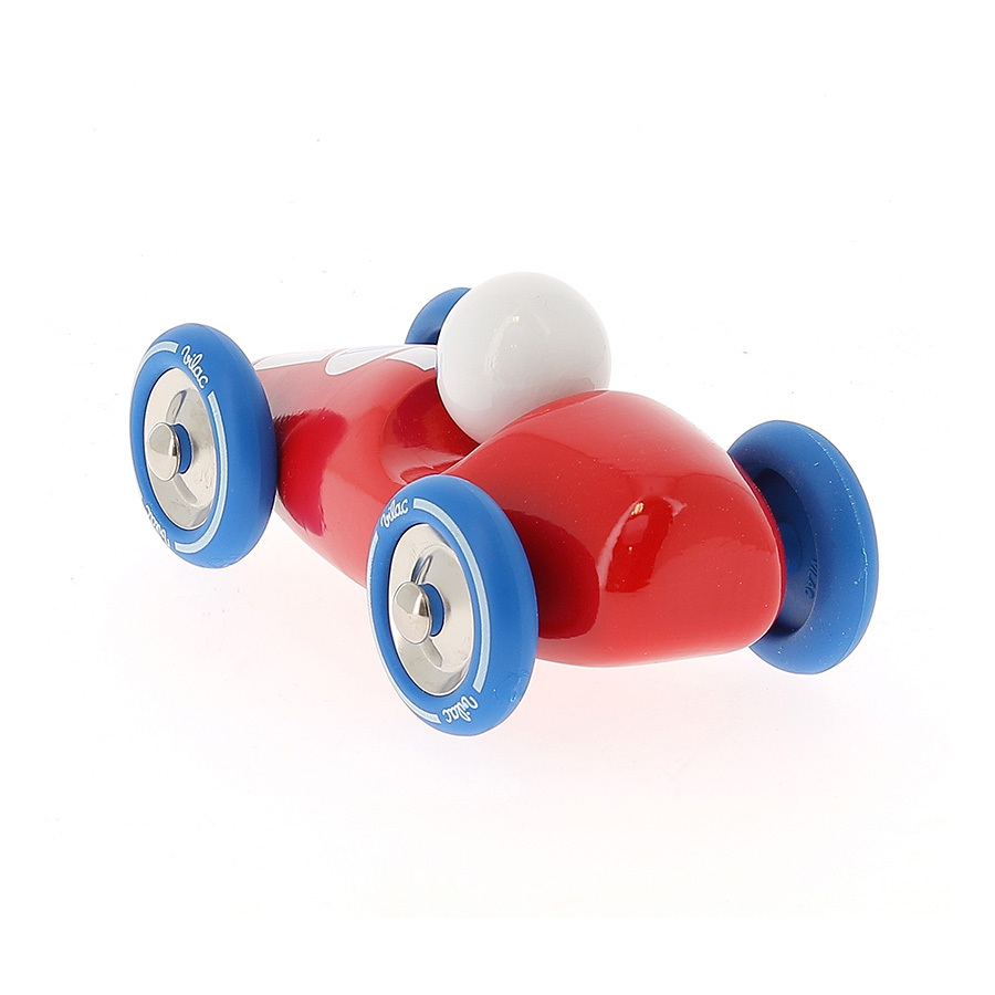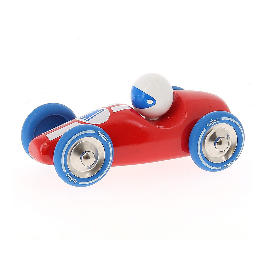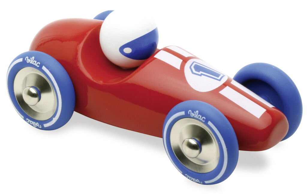 Červené pretekárske auto vyrobené z lakovaného dreva s kovovými pogumovanými kolesami. Je vhodné ako na hranie tak ako dekorácia do izieb detí či dospelých. Vyrobené vo Francúzsku. Hlavné vlastnosti: vyrobené vo Francúzsku