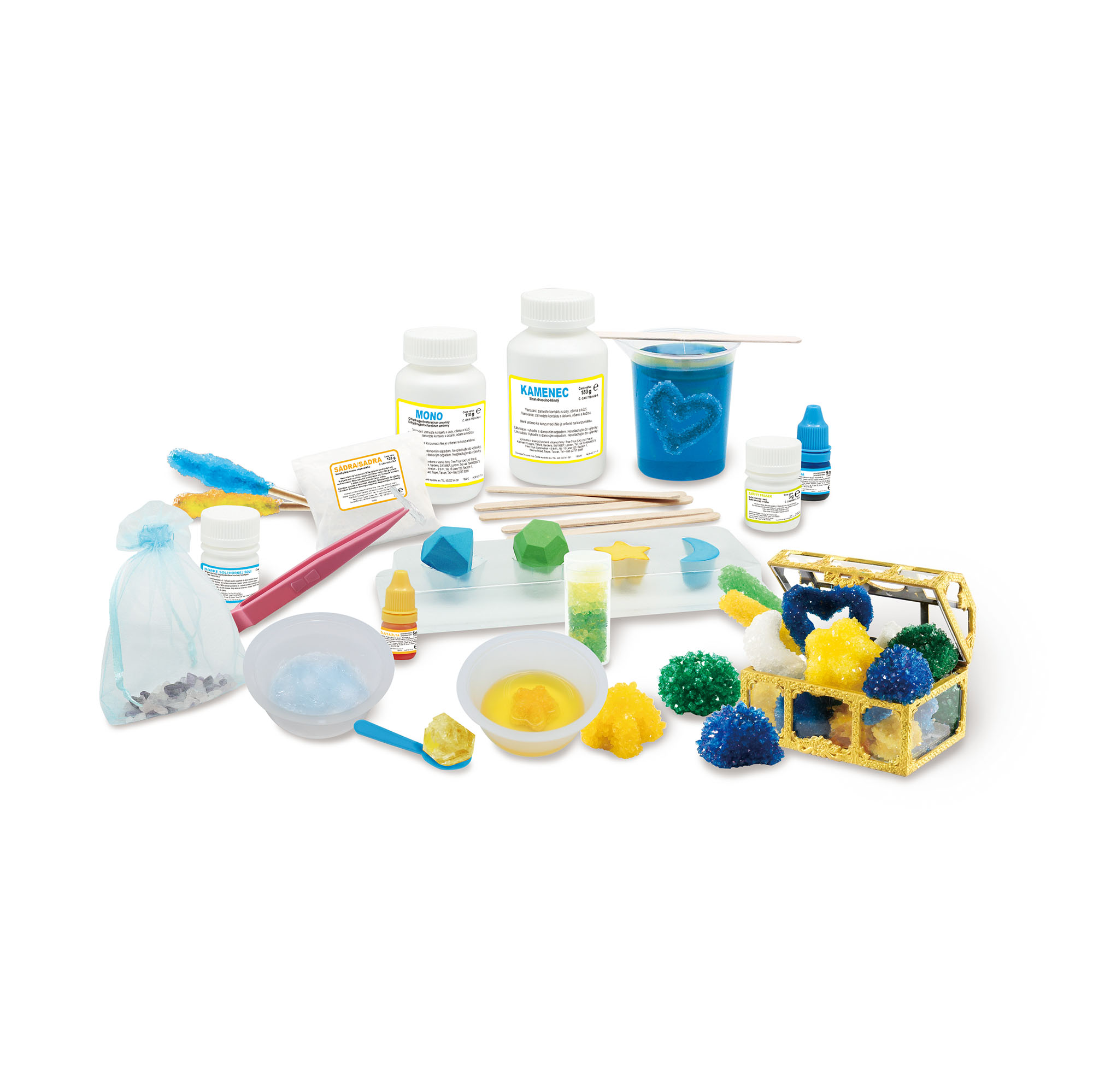 Ako geológovia preskúmajte hlboko ukryté poklady Zeme. Vytvorte si pomocou skutočných laboratórnych techník poklad plný kryštálov. Sledujte, ako kryštály rastú na sadrových odliatkoch rôznych tvarov, ktoré si sami vytvoríte a pozorujte svietiaci kryštál v tme v tvare mesiaca. Vytvorte si kryštálové srdce alebo vypestujte kryštály na drevenej palici. Trúfnete si vypestovať obrí krištáľ? Kryštály sa v prírode tvoria milióny rokov, ale čo si ich vyrobiť doma cez noc? Naplň truhlicu kryštalickými drahokamami a kryštálom svietiacim v tme. Vyrob si kryštalické "črepy" a sladké aj slané kryštály z kuchyne. Rôzne druhy chemických látok tvoria rôzne druhy kryštálov, objav a otestuj ich všetky! Súprava Žiarivé Kryštály z edície Albi Science obsahuje skvelú „pozlátenú“ truhlu na uchovanie vašich pokladov. Sada Žiarivé kryštály obsahuje: kamenec 180 g, mono (dihydrogénfosforečnan amónny) 110 g, horké soli 20 g, žiarivý prášok 3 g, sadru 125g, žlté tekuté farbivo 5 ml, modré tekuté farbivo 5 ml,, lyžice, plastové misky, priehľadnú plastovú ampulku s viečkom, penový držiak na tyčku, vrecko s polodrakhokamy, vlasec, čistič fajok, pokladnicu a formu na sadru.
